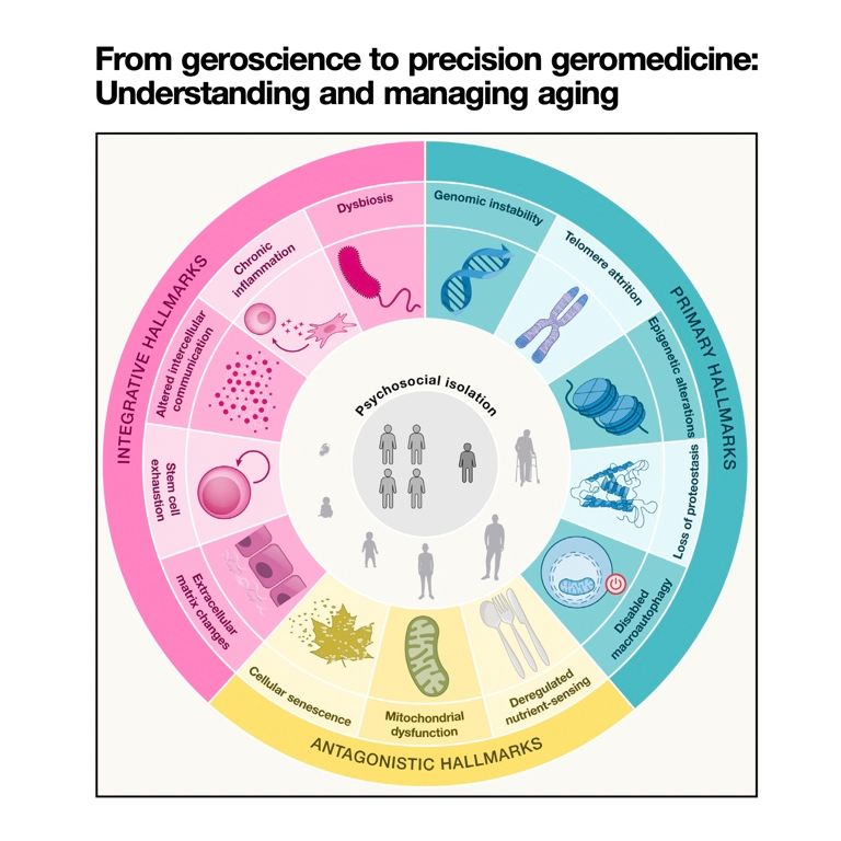 This review discusses the advancements in geroscience and precision geromedicine, two emerging fields aimed at understanding and managing human aging. The article outlines the hallmarks of aging, which are the molecular, cellular, and supracellular mechanisms that lead to biological aging, and introduces the concepts of pro-aging genes and anti-aging genes, which can accelerate or delay the aging process. The article further explores the use of multi-omics technologies as biomarkers of aging, with the goal of providing a foundation for individualized treatment, and proposes strategies for preventing and treating age-related diseases by targeting aging itself. It ultimately paints a future outlook for precision geromedicine, emphasizing its potential for early intervention in healthy individuals to optimize health and extend healthy lifespan.