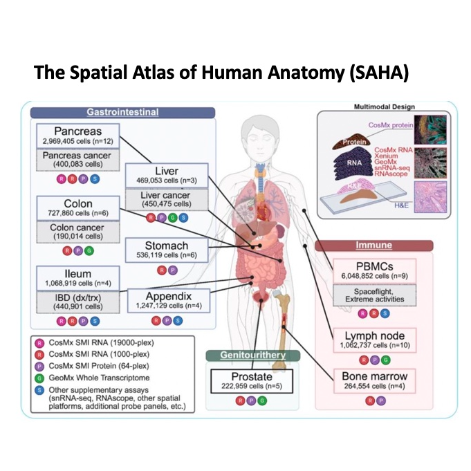 This paper describes The Spatial Atlas of Human Anatomy (SAHA), an innovative and comprehensive resource that maps human tissues at subcellular resolution. SAHA integrates spatial transcriptomics, proteomics, and histological data from over 100 healthy donors, primarily focusing on gastrointestinal and immune systems. This atlas provides a healthy tissue reference that allows for comparative analysis with diseased tissues, such as colorectal cancer and inflammatory bowel disease, revealing disease-associated spatial disruptions and offering insights into therapeutic responses. The data is openly accessible through a FAIR-compliant portal, establishing a foundational framework for spatial diagnostics and precision medicine.