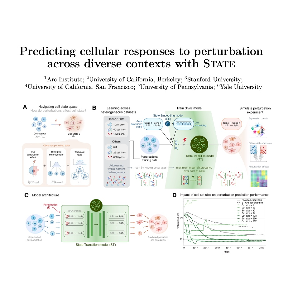 The Arc institute introduces State, a novel machine learning model designed to predict cellular responses to various perturbations, such as genetic or chemical treatments. The model tackles key challenges in the field, including cellular heterogeneity and technical variation across datasets, which often limit the generalization of existing computational models. State utilizes a multi-scale architecture, comprising a State Transition (ST) model that learns perturbation effects across cell populations and a State Embedding (SE) model that generates robust cell representations from vast observational data. Evaluated using a comprehensive framework called Cell-Eval, State consistently outperforms prior approaches in predicting gene expression changes and identifying differentially expressed genes across diverse cellular contexts, even in "zero-shot" scenarios where no perturbation data was seen during training for a given context. The authors also provide a theoretical analysis connecting State to optimal transport theory, indicating its capacity to learn precise transformations between cell states.