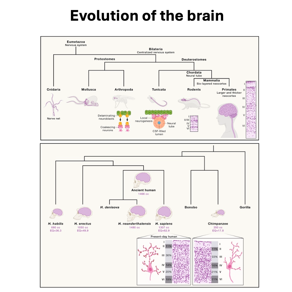 This paper explores the evolution of the human brain, focusing on the genetic and functional changes that distinguish it from other species. It traces the nervous system's development from primitive organisms through chordates and mammals, highlighting key evolutionary innovations like the neural tube and neocortex. The discussion then narrows to primate and human-specific neurobiology, examining quantitative differences in neuron numbers and morphological complexity that contribute to enhanced cognition. Finally, the source details cutting-edge methods—such as brain organoids and comparative omics—that are providing mechanistic insights into these evolutionary changes and paving the way for future discoveries in the field.