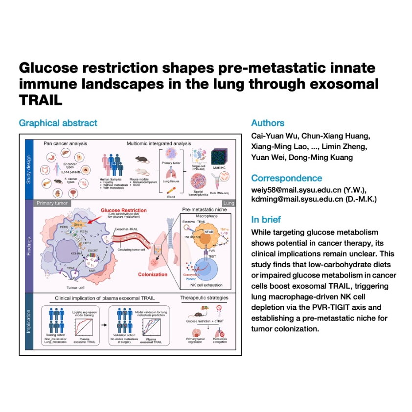 This research explores the paradoxical relationship between glucose restriction and cancer metastasis, specifically focusing on lung metastasis. The study reveals that while low-carbohydrate diets or impaired glucose metabolism can suppress primary tumor growth, they unexpectedly promote lung metastasis by altering the immune landscape. This occurs through exosomes containing TRAIL protein, which are released by glucose-deprived cancer cells. These exosomes then polarize lung macrophages, leading to the exhaustion of natural killer (NK) cells via the PVR-TIGIT pathway, thereby creating an environment conducive to tumor colonization. The research also highlights plasma exosomal TRAIL as a superior biomarker for predicting early postoperative lung metastasis in hepatocellular carcinoma (HCC) patients, offering potential for improved diagnostic and therapeutic strategies like anti-TIGIT therapy.
