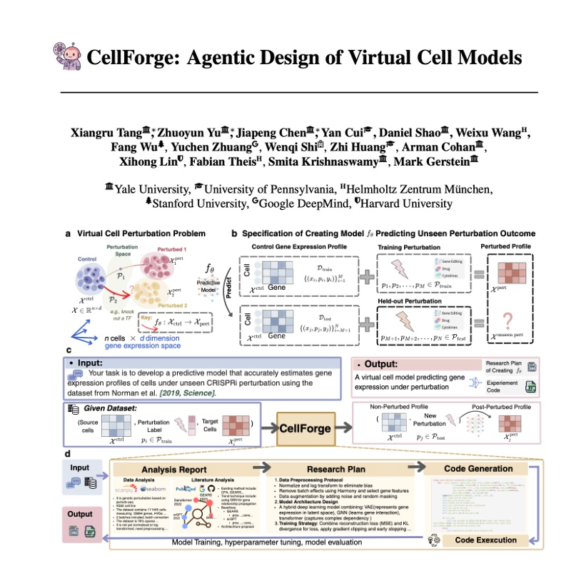 The paper introduces CellForge, an innovative agentic system designed for autonomously creating virtual cell models to predict cellular responses to various biological perturbations. This system employs a multi-agent framework, where specialized AI agents collaborate across three core modules: Task Analysis (characterizing datasets and retrieving literature), Method Design (developing optimized modeling strategies through expert discussion), and Experiment Execution (generating and validating executable code). CELLFORGE consistently outperforms existing methods in diverse perturbation prediction tasks, demonstrating significant improvements in accuracy and correlation across different data modalities. Its strength lies in its ability to adaptively design model architectures by integrating biological knowledge and iteratively refining solutions through graph-based expert discussions among agents, rather than relying on predefined heuristics.