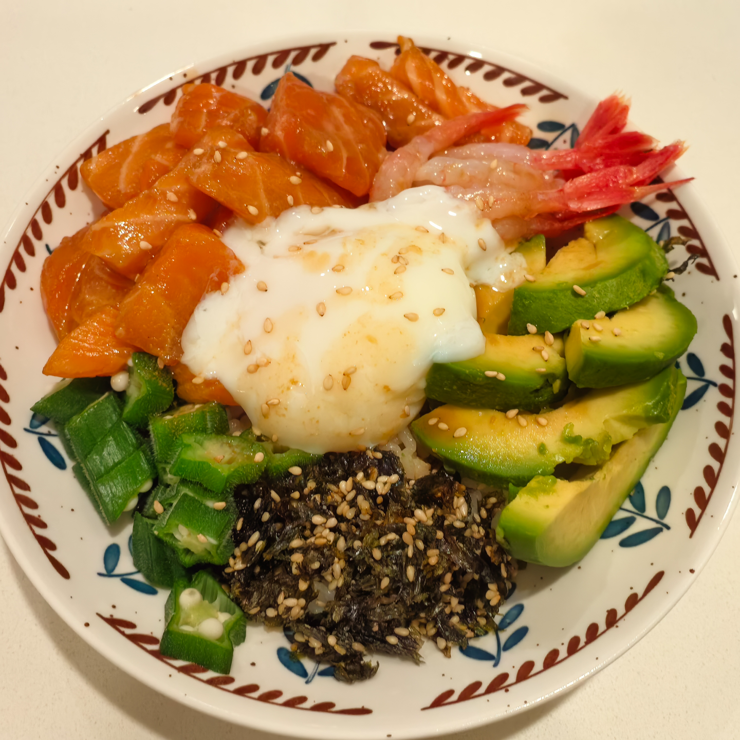 - 波奇饭:温泉蛋+三文鱼+甜虾+秋葵+海苔+酱油芥末