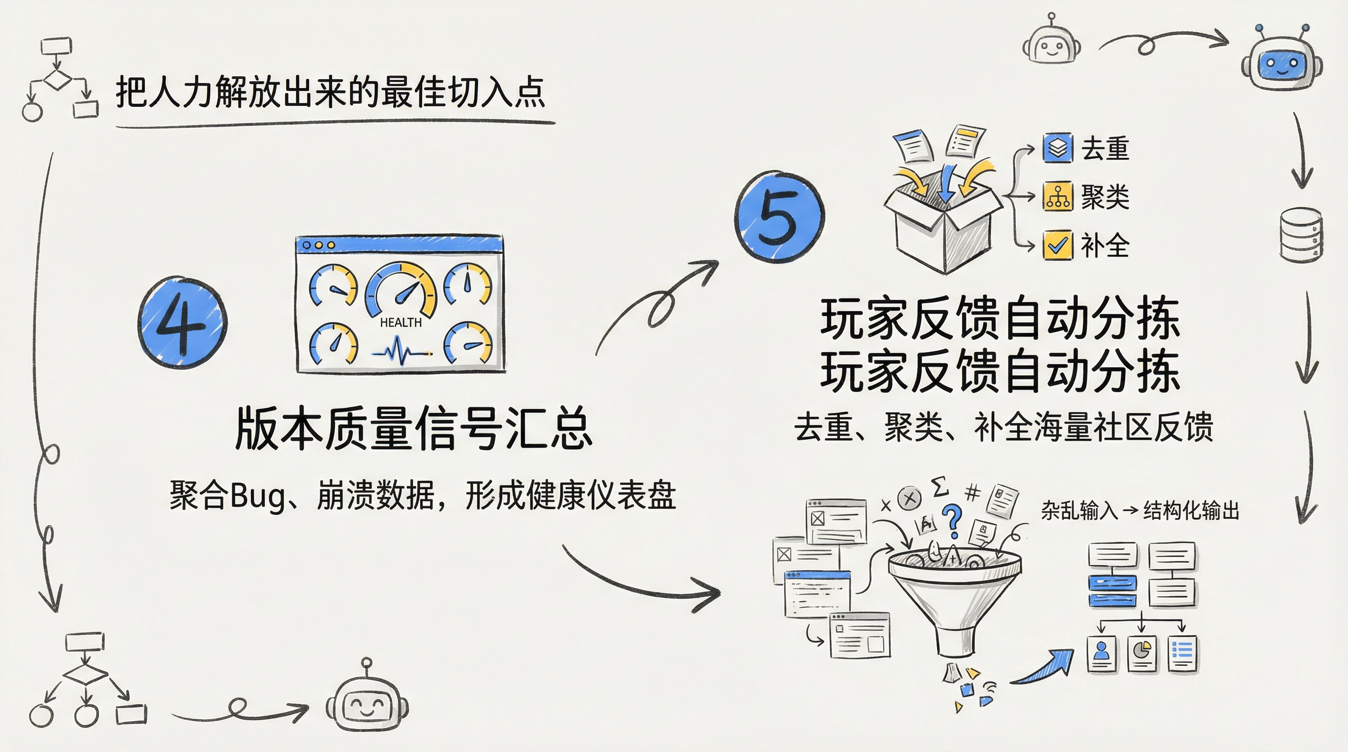 5)全民测试反馈分拣:去重聚类、复现步骤补全、模块归类、优先级建议