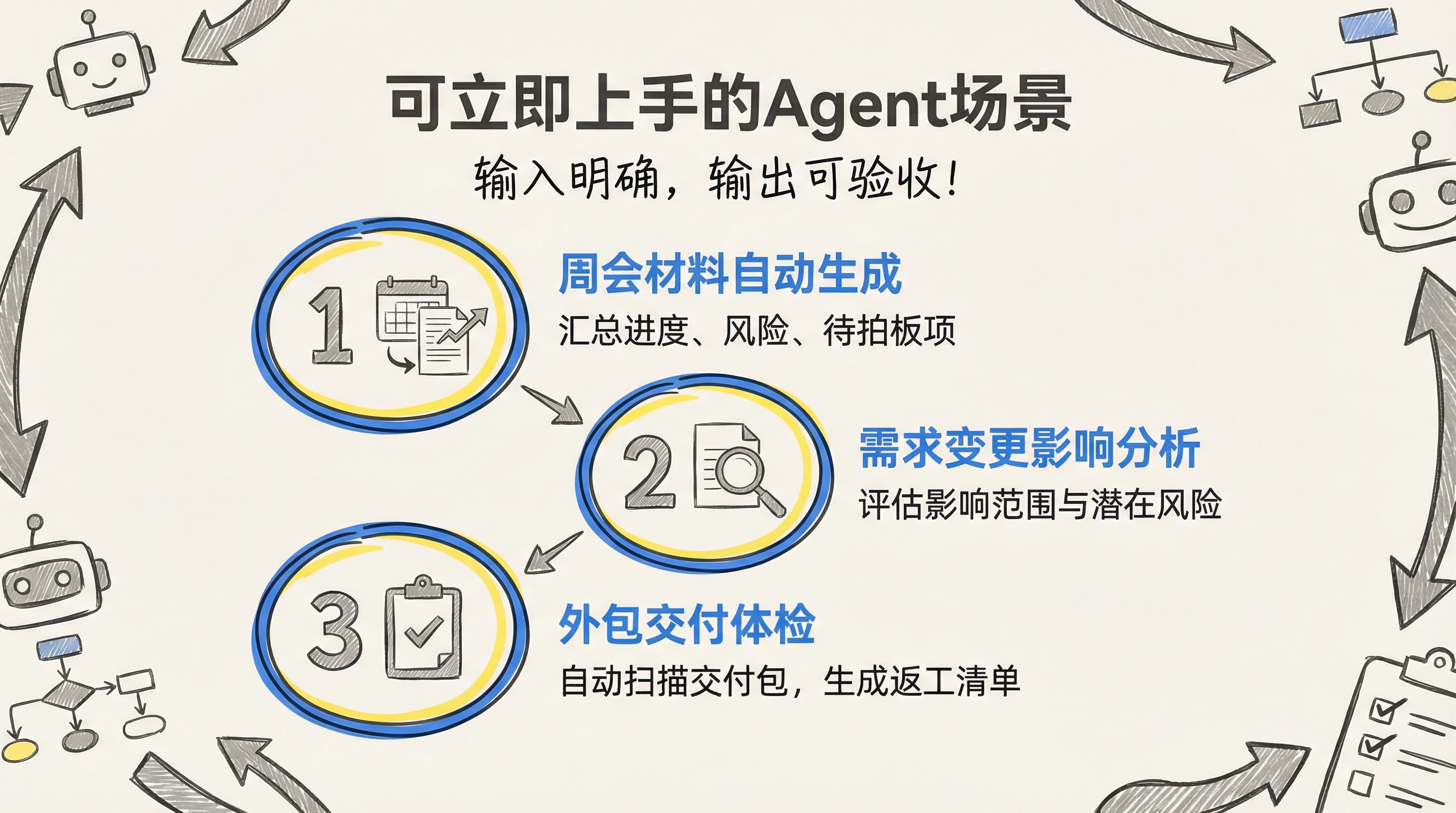 1)周会材料自动生成:进度、风险、依赖、需要拍板的问题、下周动作