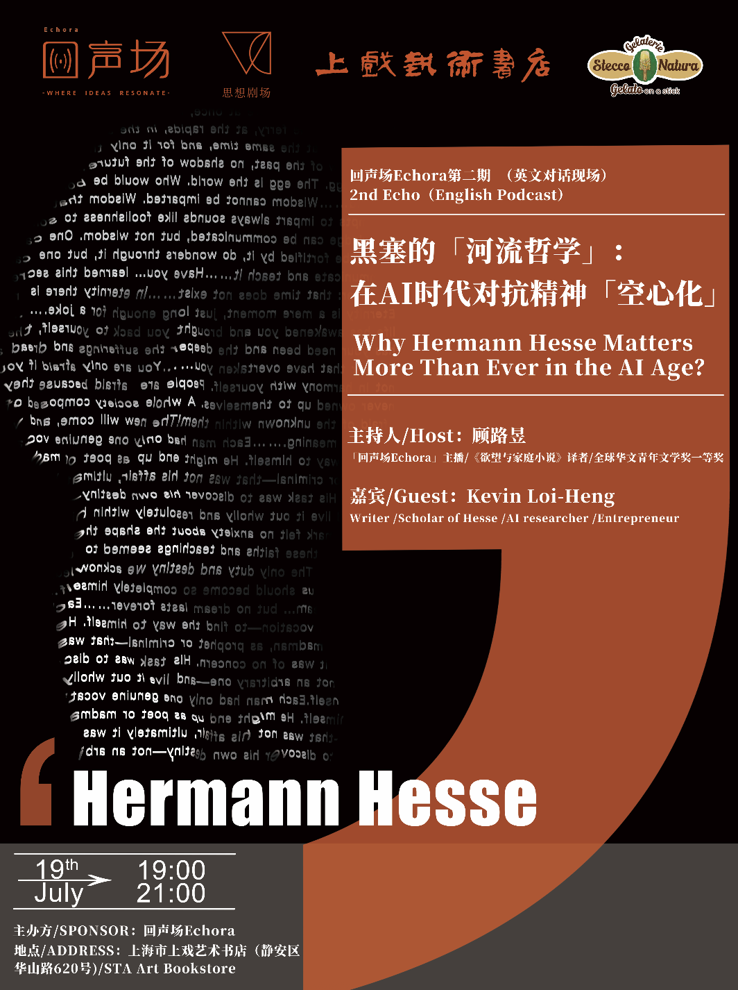 base伦敦的作家、黑塞学者、AI研究员、企业家,影像创作者,他在伦敦大学学院传授过AI伦理课程,也在伦敦、日本、克罗地亚、非洲等地作为发言人进行过AI知识的教授和演讲。Kevin有中国、非洲、葡萄牙的背景,本人热爱文学,对黑塞文学的东方哲学和中国文化充满兴趣,也在小红书上分享自己关于黑塞、文学的见解和学中文的生活。这次有机会来中国,很想把第二场黑塞读书会(第一场在伦敦)结合诗歌、电影等艺术形式带来中国,和中国的粉丝读者一起讨论分享关于文学本身、关于个人成长、自我认知、理想世界、现实世界等年轻人感兴趣的话题。