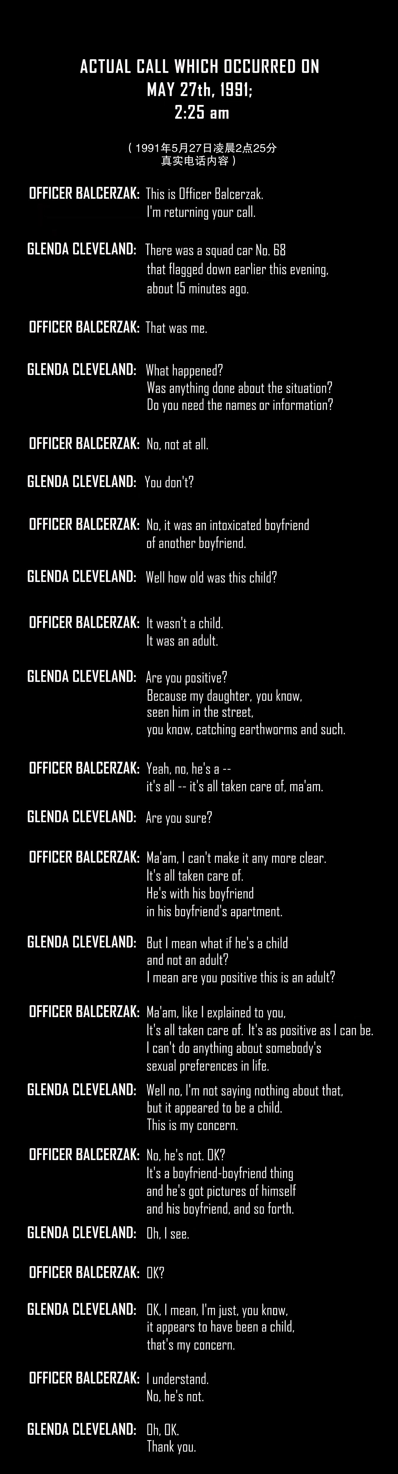 警察甚至没有核实科纳西的真实年龄和身份,就让他跟着达莫又回到了案发的公寓213房间。在警察出警后的15分钟,格林达女士曾经再次打电话询问案件情况,依旧没有引起重视,以下是1991年的真实电话录音内容: