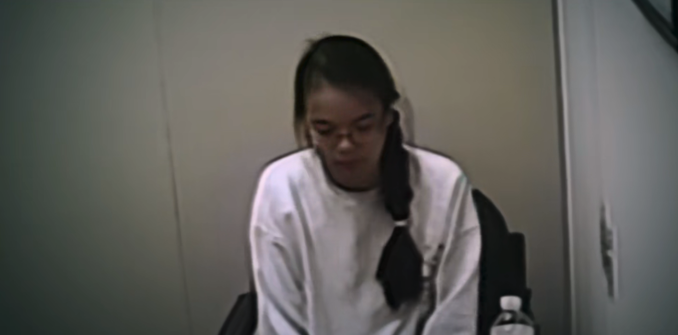 一个看起来大概很年轻的普通亚裔女孩坐在狭小的问询室里,房间很小。她穿着一件白色圆领卫衣,一条粗粗的麻花辫从左肩垂下,那双被无框眼镜遮挡的眼睛透露着一点点紧张和迷茫。