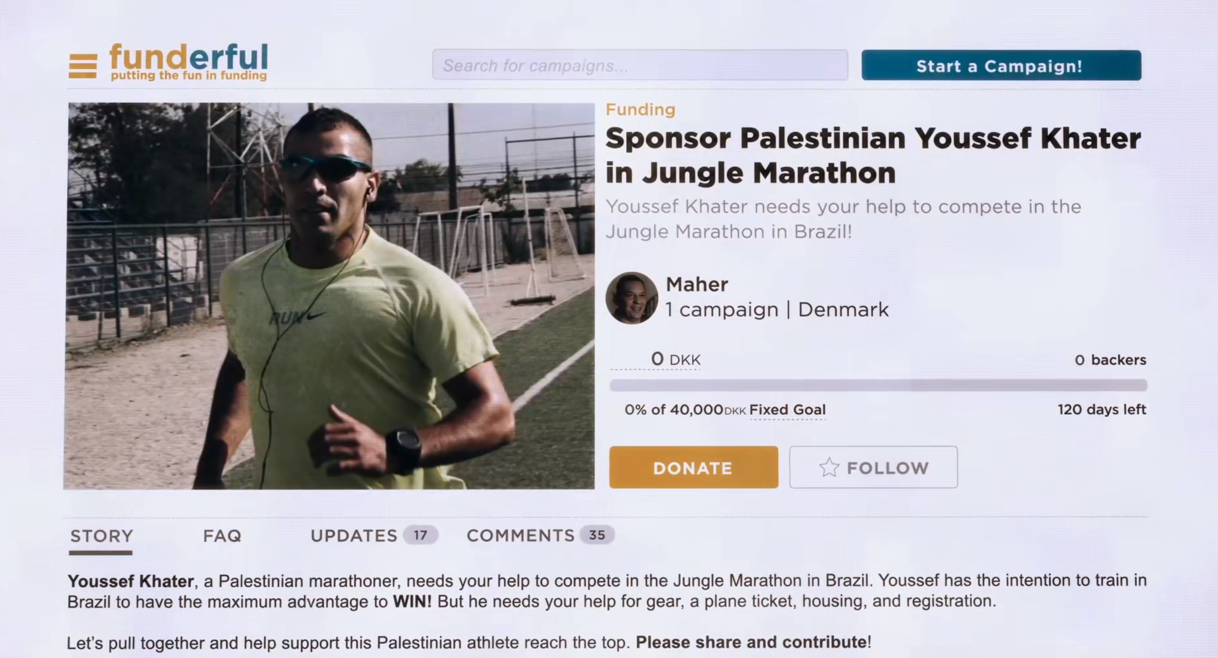 而Youssef刚好想去巴西参加越野跑,还缺一部分资金缴纳报名费还有购买装备,机票,负担比赛前后的住宿伙食这类的费用,简单来说就是他需要募集一笔资金去完成自己的极限运动理想。他在网上发现了Maher他们在运营的巴勒斯坦同乡会,立即想到他们可能可以给自己提供点帮助,于是主动联系Maher告诉他自己也是巴勒斯坦人,想代表巴勒斯坦参加一场在巴西举办的国际越野比赛,他会让所有站在终点线的人们都看到他高举过头顶的国旗。但是他非常需要资金上的支持,不然他可能都到不了比赛的起点。这个说法非常打动Maher,他立马来了兴趣,问Youssef具体需要多少钱,Youssef也是直接了当的报出了一个数字:4万丹麦克朗。这个数字是报名费的十倍!