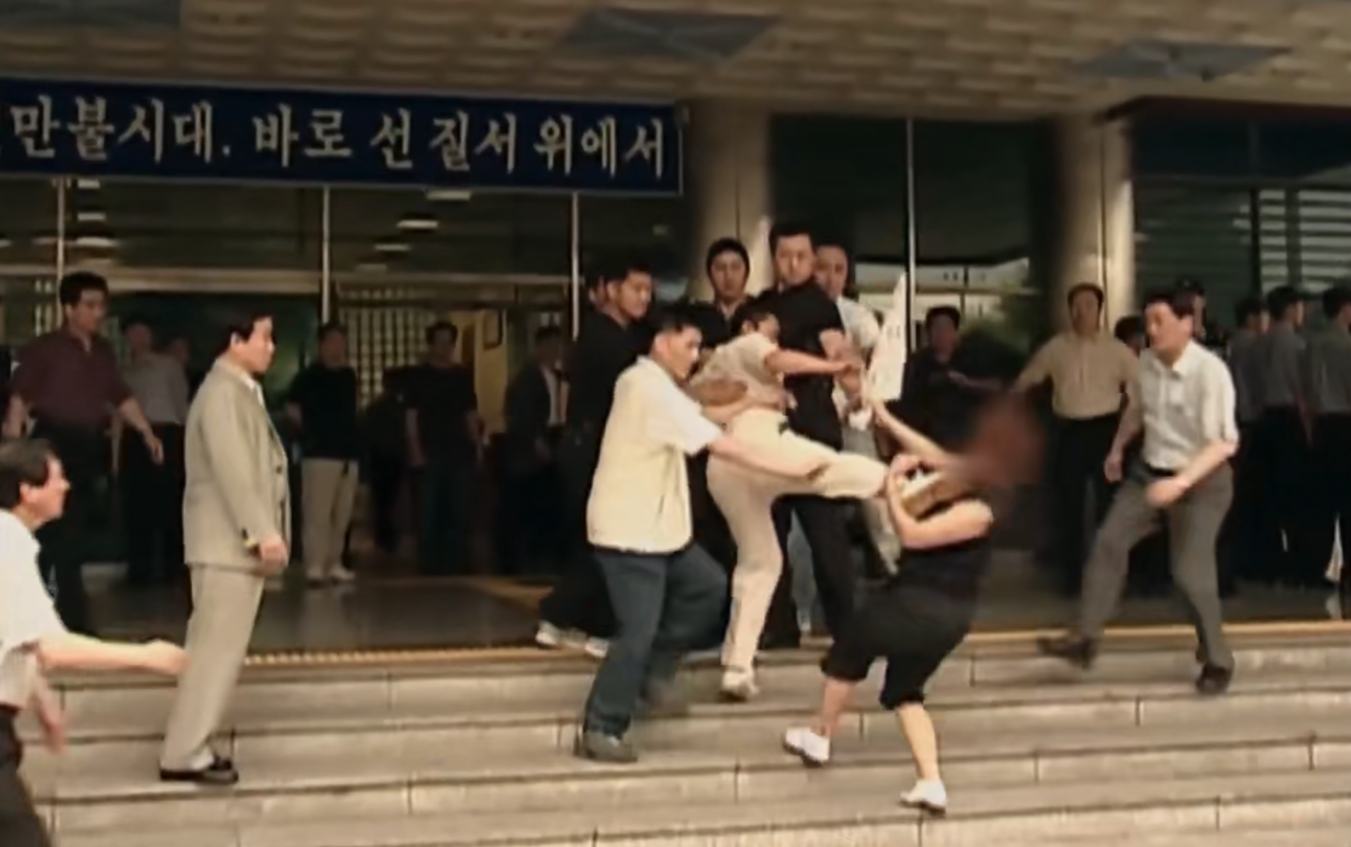 当时他们从永登浦警察局出发移送检方的过程是全程实况转播的,因为柳永哲曾经从警察大楼里逃脱,这一次警方一共出动了120名警员参与移送。被两名警察押解到警察局门口的柳永哲刚刚站定,一名女性受害者家属突然不知道从哪冲过来手里举着雨伞似乎想要打掉柳永哲扣在头上的帽子,一边大声喊着:如果早点抓住他的话我的女儿就不会死了!结果刚冲上台阶几步,那些对办案束手无策的警察面对受害者家属倒是神勇无比,抬起脚对着这位女士的胸口就是一个飞踢,这位女士一下飞出去几米远后背着地摔在台阶下面的水泥地面上。