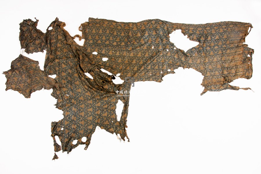 条形花卉纹锦衣残片,唐朝,藏于中国丝绸博物馆 质地:丝,色泽:蓝/黄,长:120cm,宽:122cm 该件是一件典型的纬锦织物,较为破损,征集自青海民间,以蓝色为地,其上织出花卉和叶子纹样。
