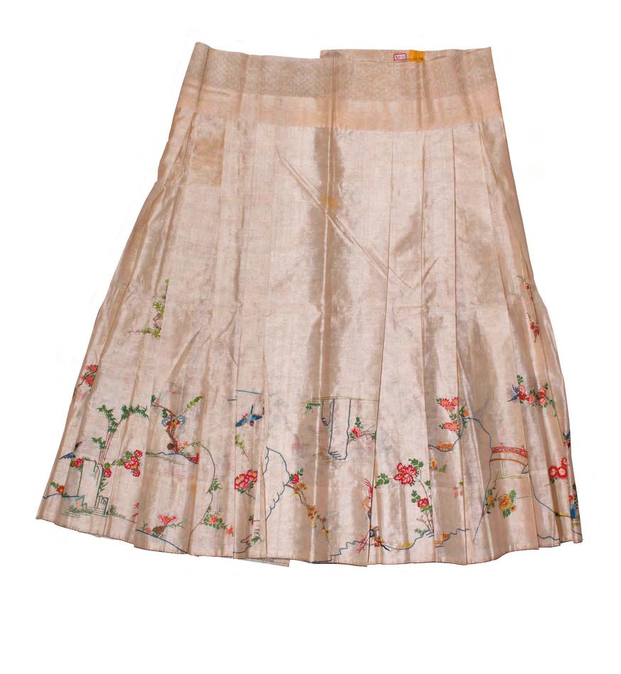 白色暗花纱绣花鸟纹裙,明朝,孔府旧藏,现藏于山东博物馆。 裙长:88cm,直摆:124cm,腰围:120cm。 马面裙式。裙分为两大片,每片均由三幅织物拼缝而成,左右相向各打四褶。裙身衣料为暗花纱,纹样为折枝梅花。上部镶白色暗菱纹纱裙腰,两侧缀一对穿鼻。裙摆用红、绿、草绿、蓝、黄、黑等色丝线绣山石、小桥流水、牡丹、石榴花、菊花、睡莲、荷花、蜀葵、牵牛花、竹子、梅花、蝴蝶、翠鸟、燕子、鸾凤等纹饰。这件女裙纹饰留白空间比较大,用色素雅而宁静,好像正当年华的翩翩少女,颇具魅力。