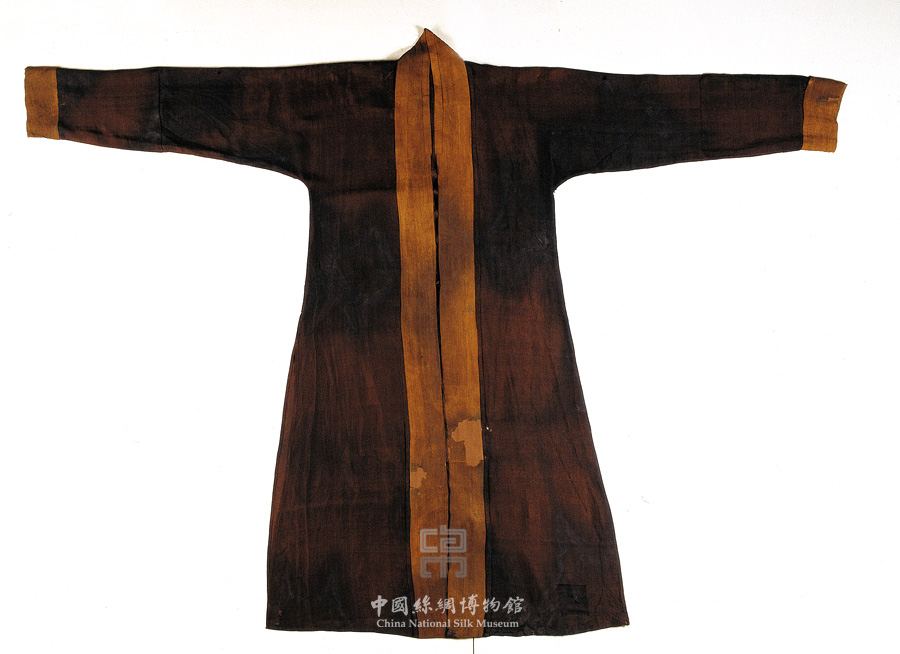 素罗背子,宋朝,收藏于中国丝绸博物馆 衣长:120cm,通袖长(宽):140cm 此罗衫对襟直领、窄袖,襟缘镶边,长至臀下。面料为褐色四经绞素罗,以黄色素罗镶领缘和襟缘。这件服装出自南宋时期一个年仅35岁地女子墓中,是宋代青年女性十分常用的服装,在大量宋人绘画中也都可以看到。考古发现的同类完整服装不少,这件尤其珍贵的是前门襟中部的一粒同面料编成的纽扣,是目前所发现的我国最早的纽扣