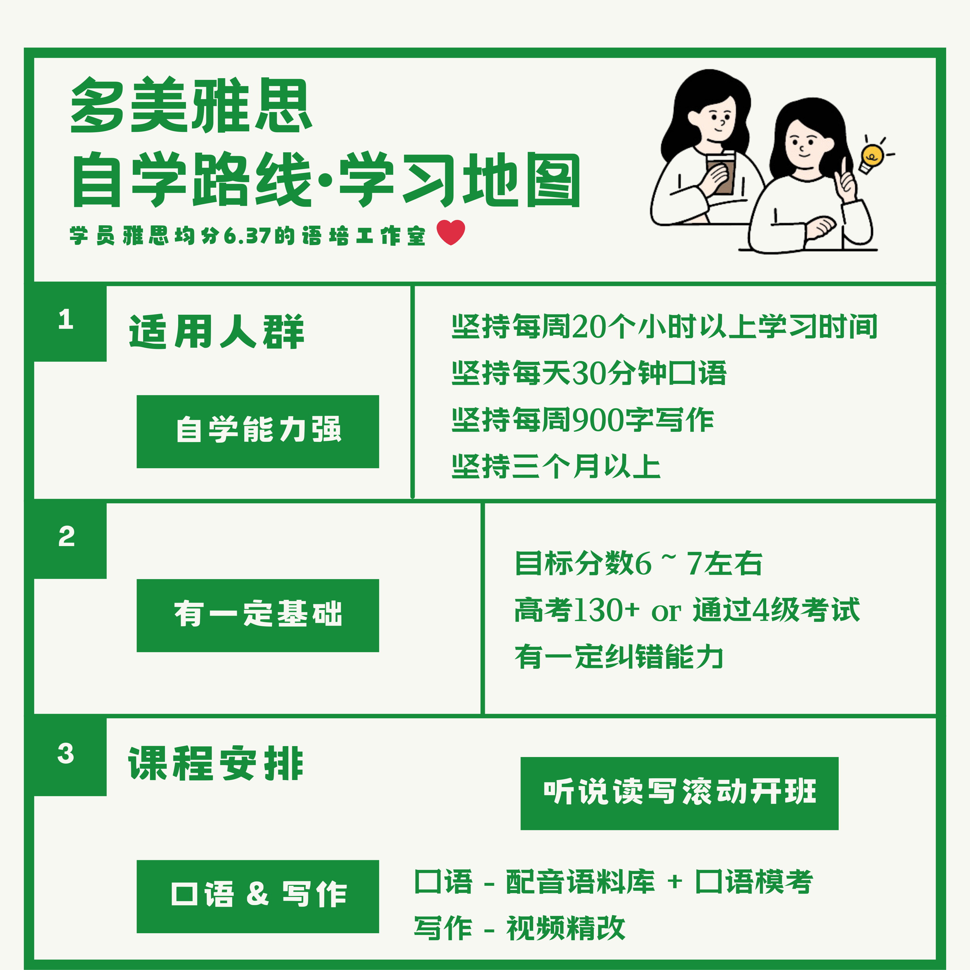 非常荣幸我们的第一期节目终于和大家见面啦,这次我们不仅分享了彼此的故事,也分享了我们反对速成骗局、价格游戏和夸张营销的坚定立场。更重要的是,我们带来了我们引以为傲的、独家的、原创的、能够满足同学们不同需求的2种学习路径——自学路线和辅导路线。