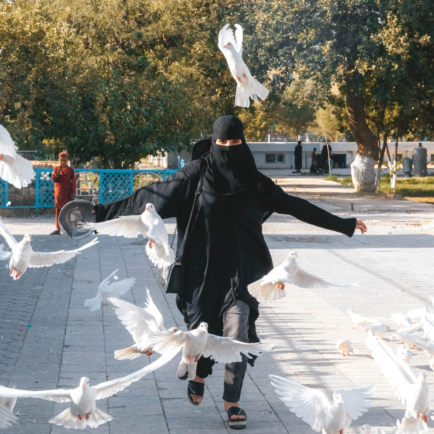 在公园里给读不起书的孩子免费教学的女老师(为了保护当地女性,面罩是手绘添加)
