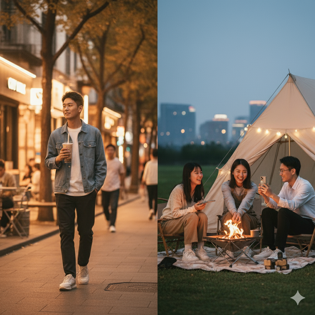 • 生活是“附近烟火”: 他们将生活的重心放在私人领域,在“附近”寻求即时、具身的幸福,例如悦己型消费(City Walk、精致露营)和圈层化社交(如找“搭子”)。