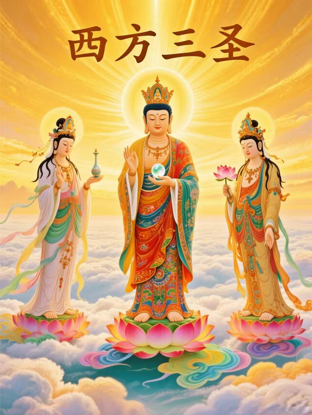 ⬆️西方三圣又称阿弥陀三尊,中间是阿弥陀fo,观世音菩萨立于fo左,大势至菩萨立于佛右。西方三圣乃是净土宗专修对象。阿弥陀fo是表无量光明,无量的寿命,无量的功德。观音菩萨是表大慈悲,宇宙的大慈悲。大势至菩萨是代表喜舍。