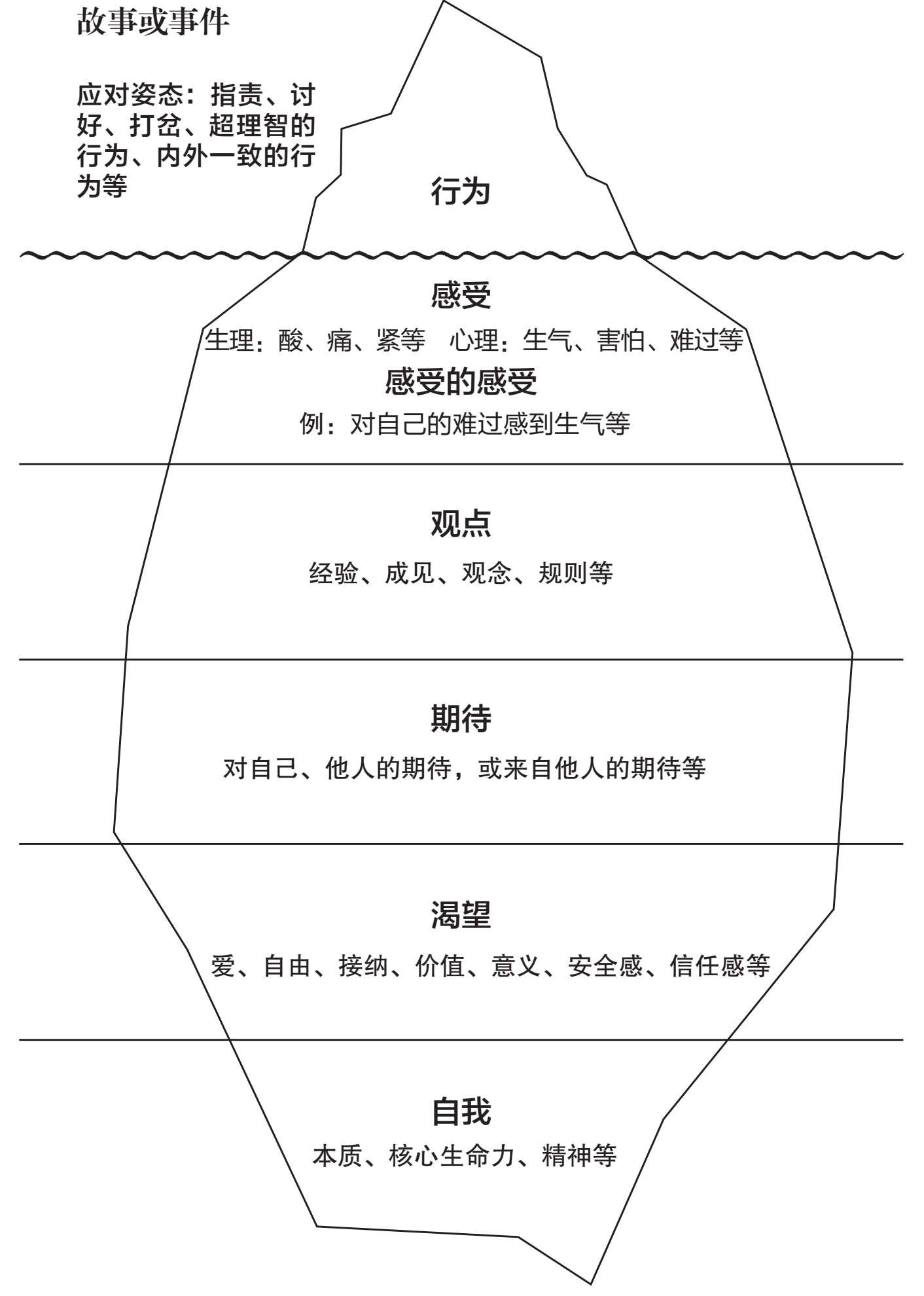 · 一致性沟通是目标: 学习冰山理论,最终是为了帮助我们达到“表里一致”的沟通状态,内外和谐,既能真诚地表达自己,又能关怀到对方。