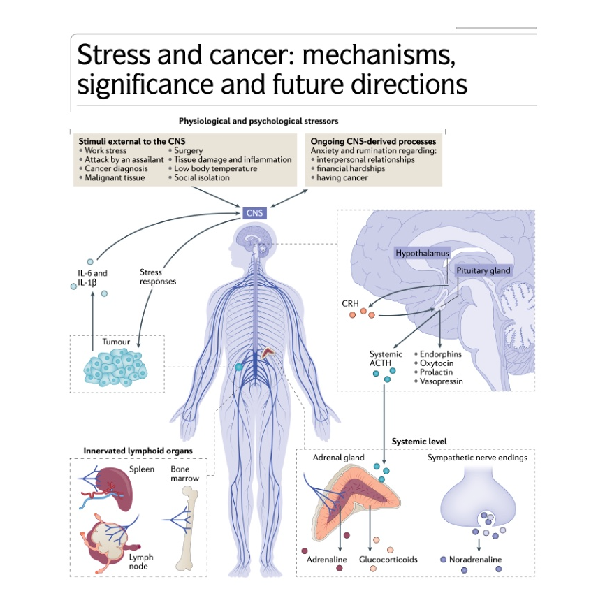这项全面的回顾性分析探讨了长期以来关于压力影响癌症发生和进展的假设。文章指出,尽管流行病学和临床试验的结果不尽相同,甚至微乎其微,导致当前医疗常规中并未将压力预防纳入癌症生存策略,但动物研究提供了大量证据,表明压力可以促进多种癌症的生长和转移。研究人员认为,临床和动物研究之间的差异可能源于临床研究在时间同步和方法学上的挑战。该分析进一步阐释了压力通过影响肿瘤细胞、微环境、免疫活动和间接调节因素来促进癌症发生、损害治疗效果及加速转移的分子和细胞机制。最终,作者建议未来通过有针对性的干预措施,在癌症进展的关键时期管理压力,并结合药物治疗来抵消医疗程序引起的生理应激反应,从而获得更确凿的临床证据。
