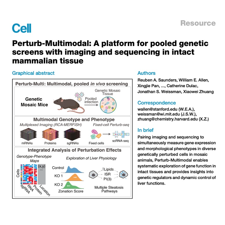 这篇资源文章介绍了 Perturb-Multimodal (Perturb-Multi),一个整合了成像和测序的创新平台,用于在完整哺乳动物组织中进行池化基因筛选。该方法通过 RCA-MERFISH 捕获原位基因型和多重 RNA-蛋白质表型,并通过 固定细胞Perturb-seq 实现体内 CRISPR 筛选并保留完整的转录组。文章详细阐述了这些技术创新,并以小鼠肝脏为例,展示了其在探索肝功能遗传调控、细胞分区、应激反应和脂肪变性方面的应用。研究人员利用该平台生成了肝脏的多模式转录和形态组织图谱,并识别了在不同生理条件下影响细胞状态的关键基因调节因子,揭示了基因型-表型关系的新见解。