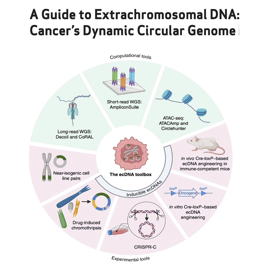 这篇文章综述了染色体外DNA (ecDNA) 在癌症中的关键作用,这是一个在过去十年中随着新技术出现而迅速发展的研究领域。ecDNA 是癌细胞中发现的环状DNA分子,携带致癌基因的扩增,并且与患者预后不良、肿瘤异质性增加、治疗耐药性以及独特的生物学特性密切相关。本文详细介绍了ecDNA的发现历史、其在各种癌症类型中的普遍性、检测和研究ecDNA的计算和实验工具,以及ecDNA形成、维持和功能背后的生物学机制。文章还讨论了ecDNA在肿瘤异质性、基因组不稳定性以及对治疗的抵抗中的作用,并展望了未来临床应用和治疗策略。