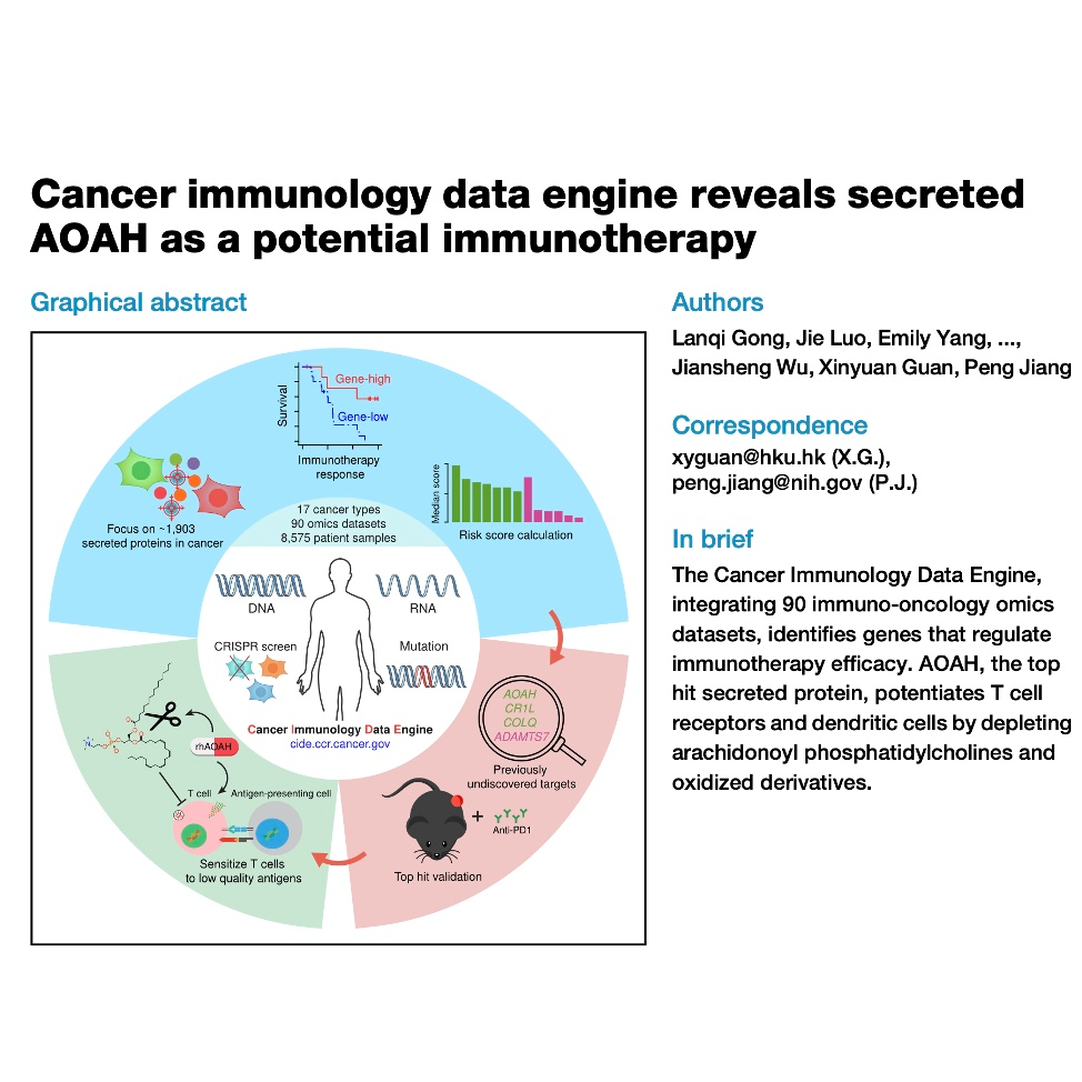 这篇文章介绍了一种名为“癌症免疫学数据引擎”(CIDE)的新型计算框架,该框架整合了大量免疫治疗患者的组学数据,以期识别在癌症免疫反应中具有关键作用的分泌蛋白。研究人员发现并验证了AOAH(酰基水解酶)作为一种潜在的免疫疗法,能够通过增强T细胞受体功能和保护树突状细胞来提高免疫治疗效果。文章详细阐述了AOAH的作用机制,即通过耗竭免疫抑制性花生四烯酰磷脂酰胆碱及其氧化衍生物来实现。此外,研究还初步探讨了CR1L、COLQ和ADAMTS7等其他分泌蛋白对肿瘤免疫的调控作用,为未来的癌症治疗策略开辟了新的研究方向。