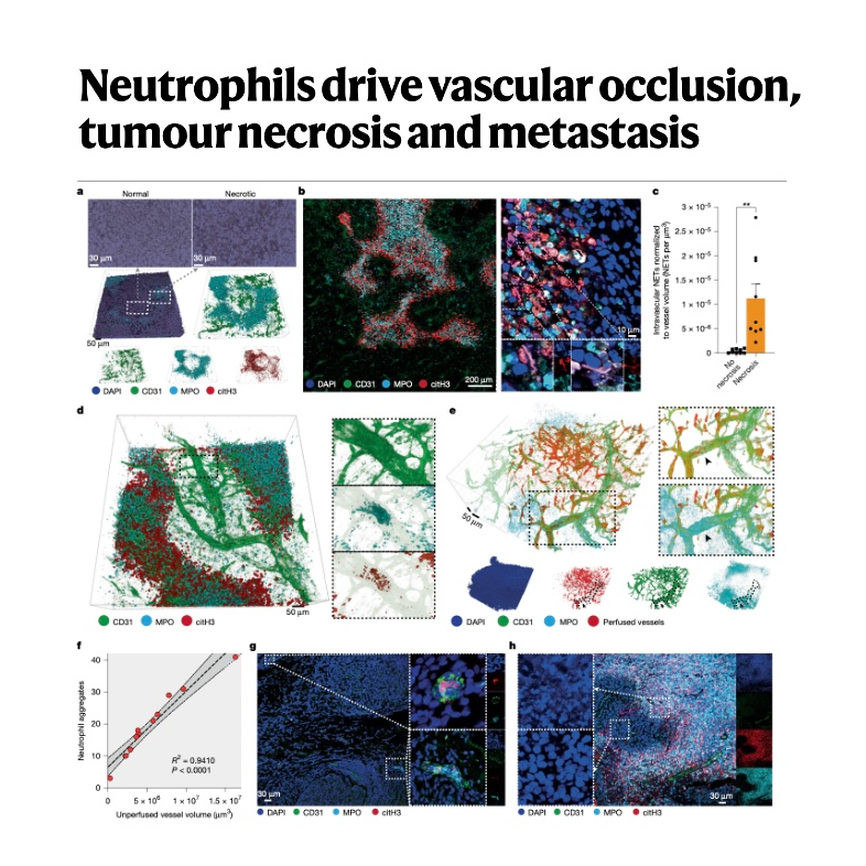 此项研究深入探讨了嗜中性粒细胞如何通过形成嗜中性粒细胞胞外陷阱 (NETs) 在肿瘤发展中发挥积极作用,特别是在乳腺癌模型中。研究人员发现,这些NETs会导致肿瘤血管闭塞,从而引发肿瘤坏死,而这种坏死并非传统认为的被动过程。更重要的是,位于坏死区域附近的肿瘤细胞表现出上皮-间质转化 (EMT),这是一种与癌症转移密切相关的过程。通过遗传或药理学手段抑制NETs的形成,可以显著减少肿瘤坏死和肺部转移,这表明针对NETs可能是治疗癌症转移的新策略。