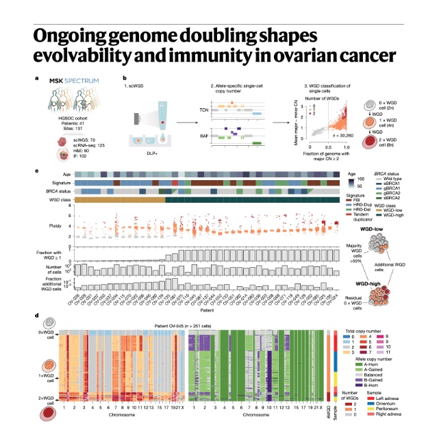 这篇研究论文探讨了全基因组倍增(WGD)在高级别浆液性卵巢癌(HGSOC)中如何驱动肿瘤进化和免疫逃逸。研究人员使用了单细胞全基因组测序、单细胞RNA测序和免疫荧光显微镜等多种技术,对41名HGSOC患者的70份肿瘤样本进行了分析。他们发现WGD是一个持续的突变过程,与更高的细胞多样性和染色体错分离率相关。此外,研究揭示了WGD高肿瘤(主要发生WGD)表现出细胞周期失调和免疫抑制状态,而WGD低肿瘤(主要为二倍体)则表现出炎症信号传导和cGAS-STING通路激活。这些发现为理解HGSOC中WGD的作用及其对治疗策略的潜在影响提供了关键见解。