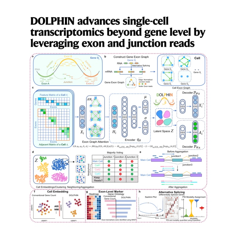 这项研究介绍了一个名为 DOLPHIN 的深度学习框架,该框架旨在通过整合 外显子水平和剪接点读取数据 来提升单细胞RNA测序(scRNA-seq)分析的精度。传统的基因计数方法往往忽略这些详细信息,从而限制了对细胞异质性和替代剪接模式的理解。DOLPHIN 将基因表示为图形结构,并利用 变分图自编码器 生成更精确的细胞嵌入,从而在 细胞聚类、生物标志物发现和替代剪接检测 等方面表现出卓越的性能。该方法能够识别基因水平分析中常被掩盖的 细微转录组差异,并已在多种scRNA-seq数据集上进行了验证,展示了其在揭示疾病机制和治疗靶点方面的新潜力。