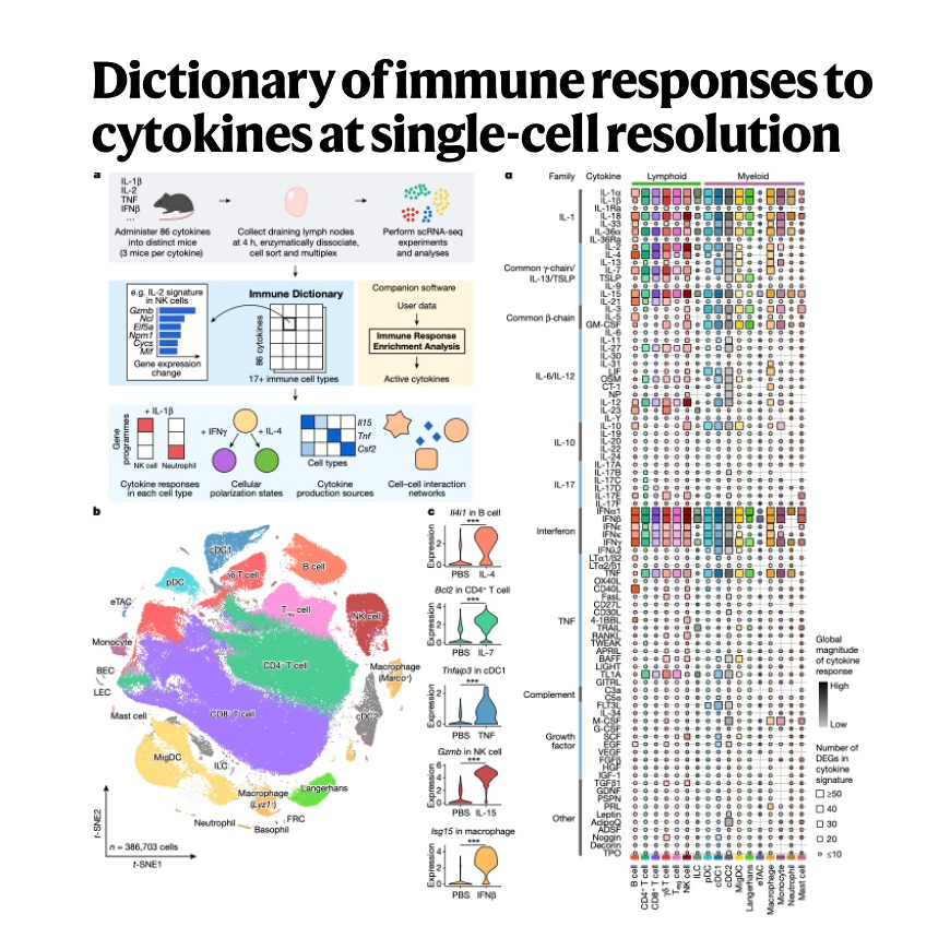 这篇文章介绍了一项名为“免疫词典”的大规模研究,该研究利用单细胞转录组测序技术,系统性地描绘了小鼠淋巴结中超过17种免疫细胞类型对86种细胞因子的反应概况。研究发现,大多数细胞因子诱导高度细胞类型特异性的基因表达变化和细胞极化状态,揭示了免疫细胞惊人的可塑性和细胞因子网络的复杂性。基于此“免疫词典”,研究人员开发了配套软件“免疫反应富集分析(IREA,该软件能够从基因表达数据中推断细胞因子活性、免疫细胞极化状态以及细胞间通讯网络,并成功应用于分析肿瘤免疫治疗和严重COVID-19感染等复杂免疫反应数据。