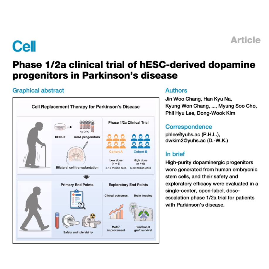 这篇文章详细介绍了一项针对帕金森病(PD)患者进行的人胚胎干细胞(hESC)衍生多巴胺祖细胞(A9-DPC)移植的单中心、开放标签、剂量递增的I/IIa期临床试验。研究的主要发现是,将高纯度A9-DPC移植到双侧壳核是安全且耐受性良好的,在12个月的随访期内没有出现肿瘤形成或细胞过度生长等严重不良事件。探索性疗效结果表明,运动症状有所改善,尤其是在高剂量组,这与多巴胺转运蛋白(DAT)结合增加的PET成像结果相一致,表明移植物存活并具有功能整合的潜力。尽管样本量较小且缺乏对照组,研究者认为这些结果支持细胞替代疗法作为PD的潜在治疗方法,并呼吁未来进行更大规模、双盲的对照试验。