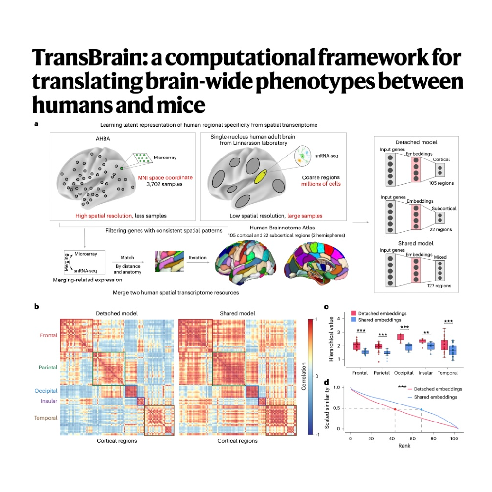 - Huang S, Zhang T, Dong C, et al. TransBrain: A computational framework for translating brain-wide phenotypes between humans and mice[J]. Nature Methods, 2025: 1-12.