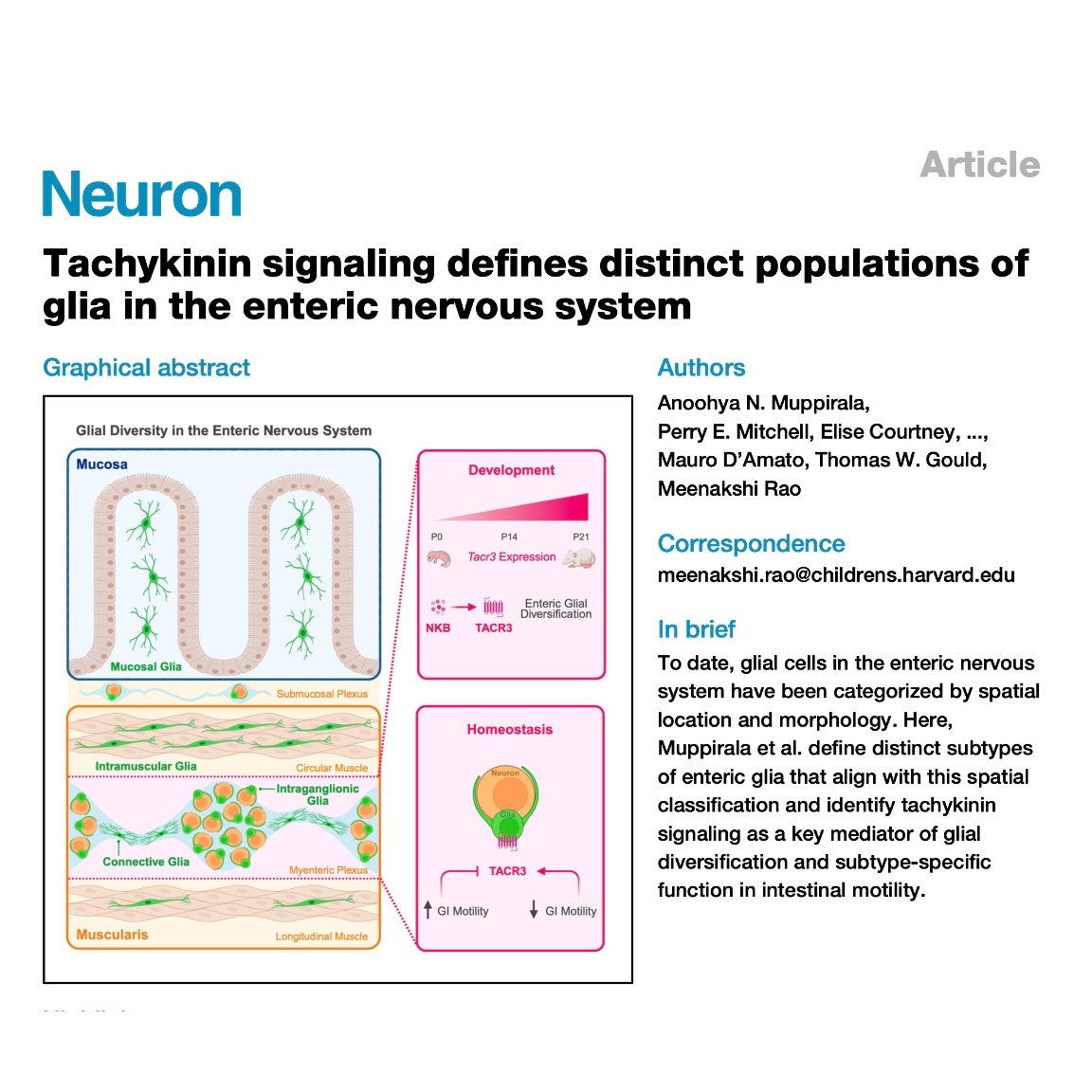 - Muppirala A N, Mitchell P E, Courtney E, et al. Tachykinin signaling defines distinct populations of glia in the enteric nervous system[J]. Neuron, 2026.