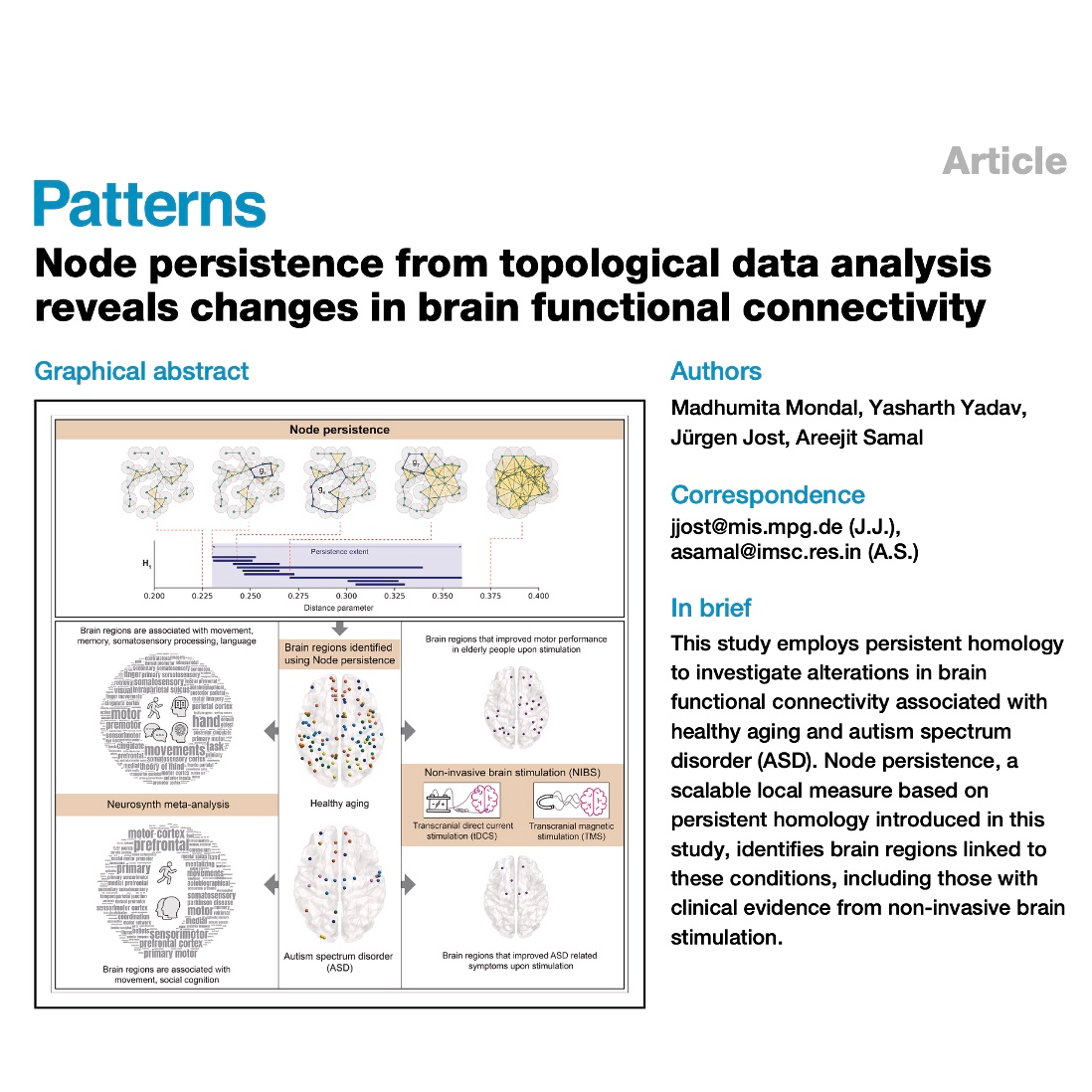 - Madhumita Mondal, Yasharth Yadav, Jürgen Jost, Areejit Samal. Node persistence from topological data analysis reveals changes in brain functional connectivity. Patterns. 2025.