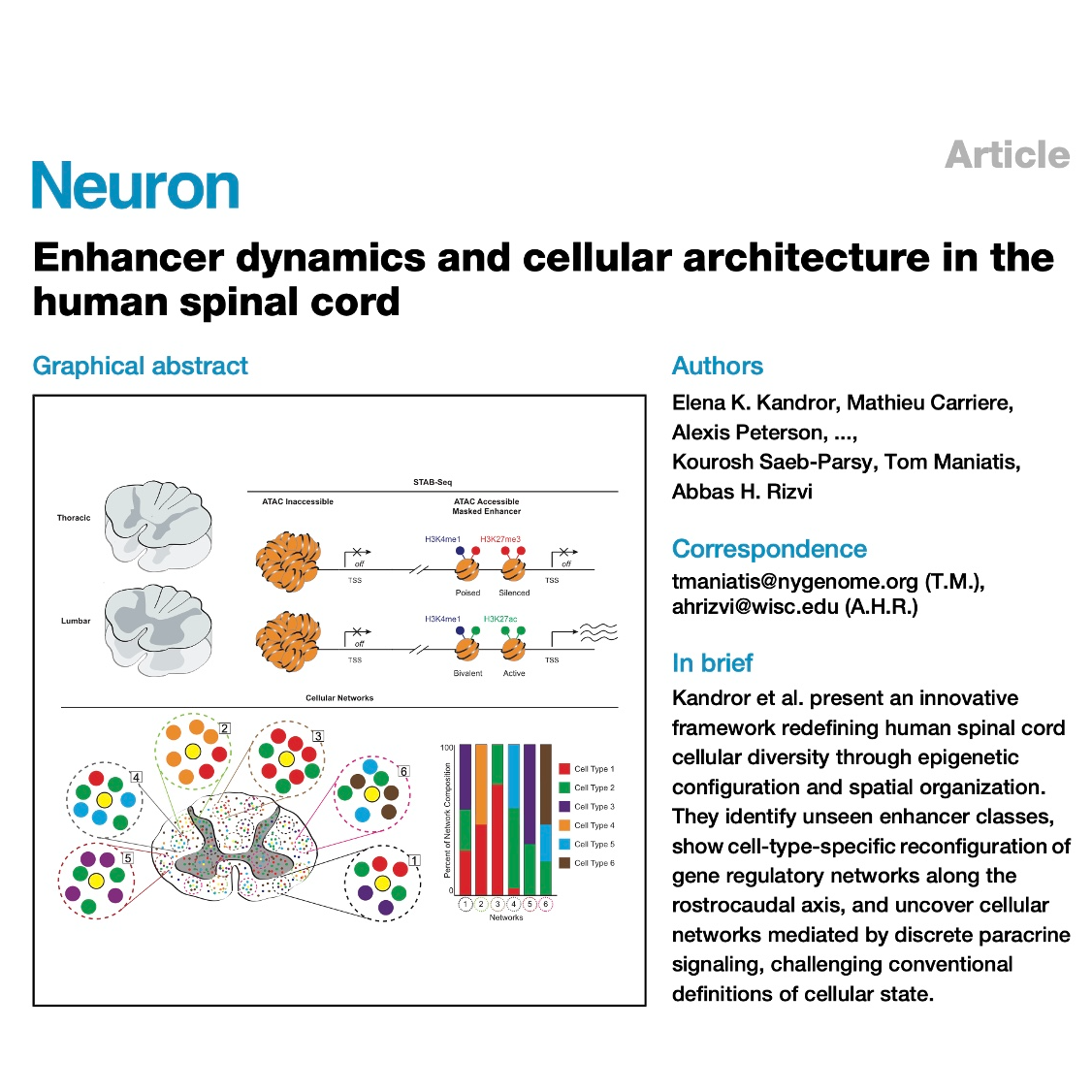- Kandror E K, Carriere M, Peterson A, et al. Enhancer dynamics and cellular architecture in the human spinal cord[J]. Neuron, 2026.