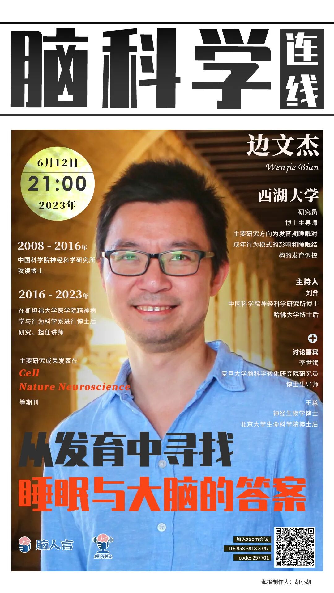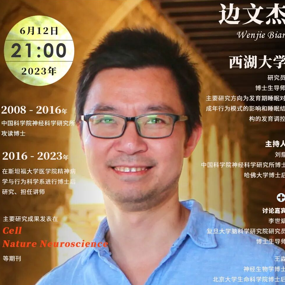 边文杰,本科毕业于浙江工业大学,2008年至2016年在中国科学院神经科学研究所攻读博士并获神经生物学博士学位,2016年至2023年先后在斯坦福大学医学院精神病学与行为科学系Luis de Lecea实验室进行博士后研究、担任讲师。主要研究成果发表在Cell、Nature Neuroscience、Sleep、Neuroscience Bulletin等期刊,获中国科学院优秀博士学位论文、Society for Neuroscience Trainee Professional Development Award、Human Frontier Science Program Postdoctoral Fellowship、Brain & Behavior Research Foundation NARSAD Young Investigator Award、Sleep Research Society Outstanding Early Investigator Award等奖项。边文杰博士于2023年加入西湖大学,任研究员、博士生导师,成立睡眠与神经发育实验室,主要研究方向为发育期睡眠对成年行为模式的影响和睡眠结构的发育调控。