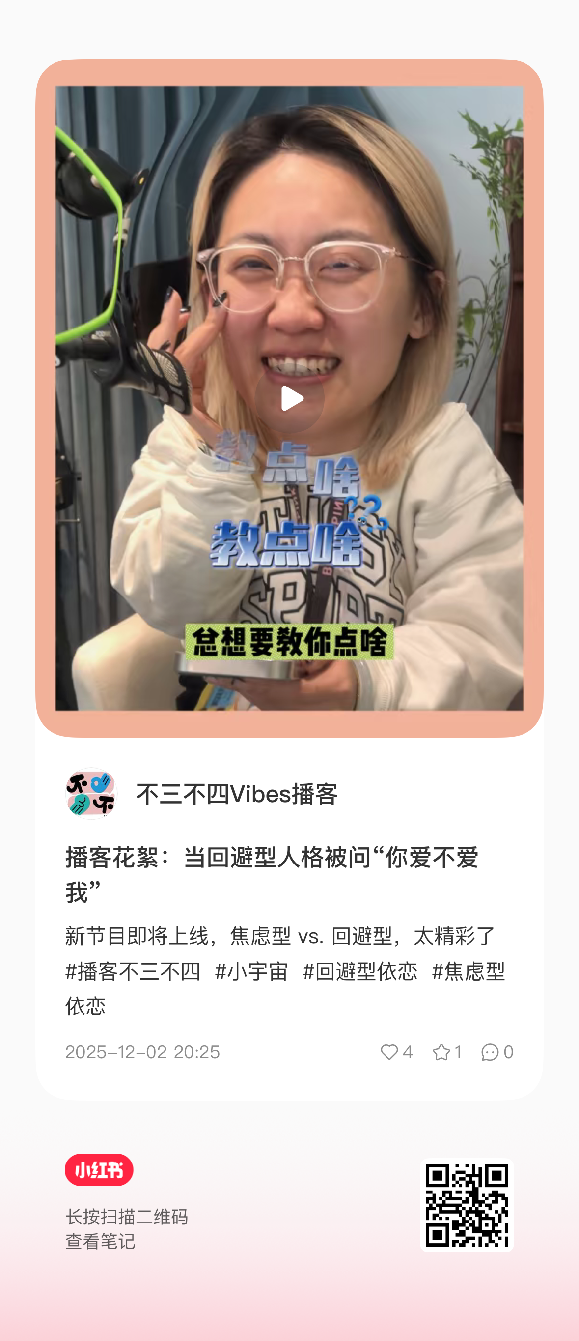 颜女士突然“塌房”了(暴言)!这位一直独来独往、连谈恋爱都想谈异地恋的经典回避型,竟然在微信上说:“我需要一个搭档”。从独行侠到渴望陪伴,这种巨大的心态转变背后发生了什么?我们也聊了聊为什么会需要一个搭档?我们到底在寻找什么样的深度链接?欢迎大家在评论区参与讨论,分享你的观点,还可以加微 wannengdezai 进入听友群,分享你的想法。