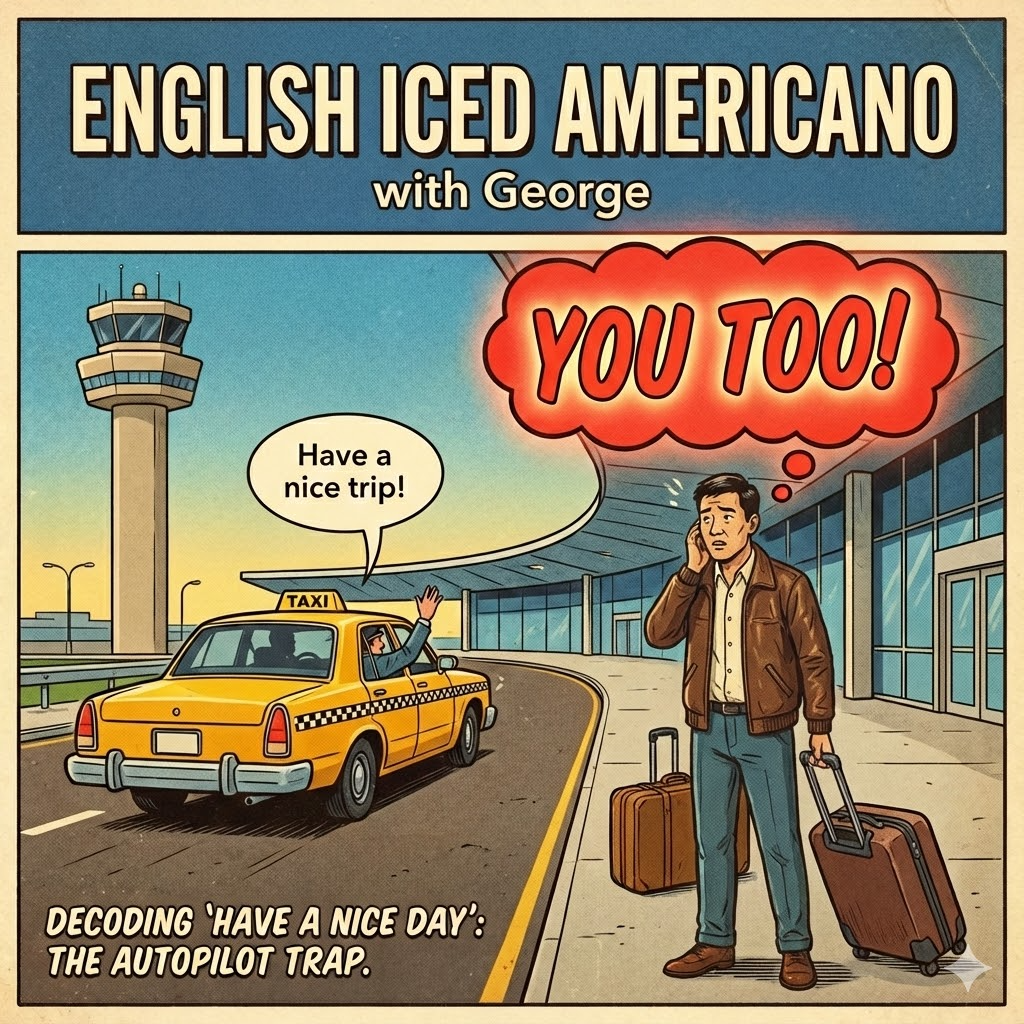 - 03:40 我的社死现场:出租车司机祝我 "Have a nice trip"(旅途愉快),我脱口而出 "You too"(你也是)。