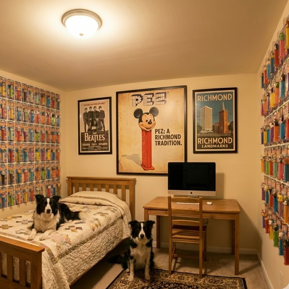 几年前,我到朋友Ray家里做客,在他里士满的家里,我遇到了两只拥有特殊“职业习惯”的边牧,它们会在我躺下的瞬间为我叼来毯子,并“强制”我盖上;我居住的客房,是一间令人瞠目结舌的房间——墙壁上挂满了 PEZ 糖果盒,仿佛睡在一个私人的波普艺术博物馆里。
