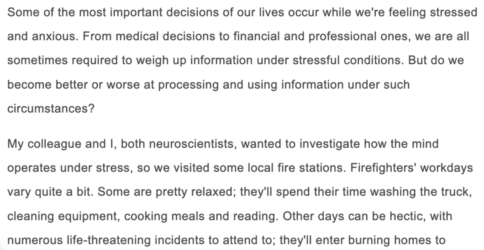 01:30-有一项关于消防员的研究 —— 其实它出自剑桥雅思20 阅读文章3