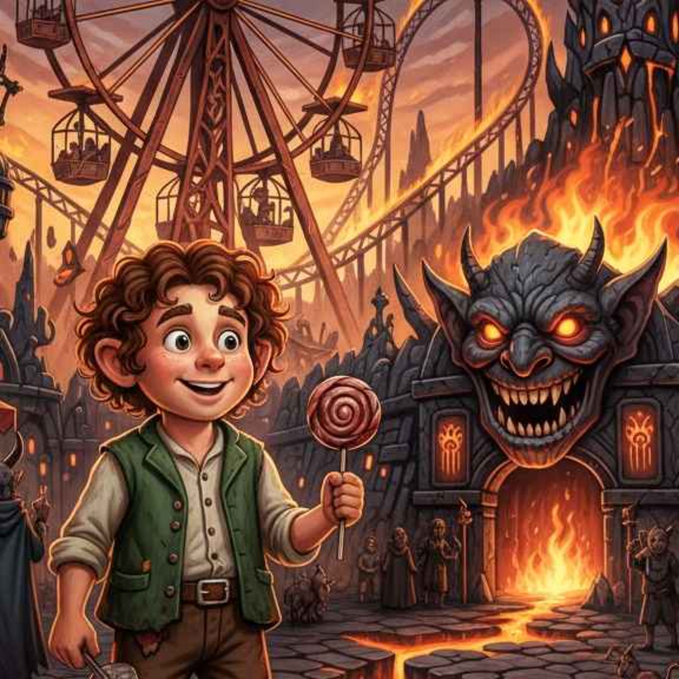 Cover Image - Google Gemini - A young hobbit at an amusement park in Hell