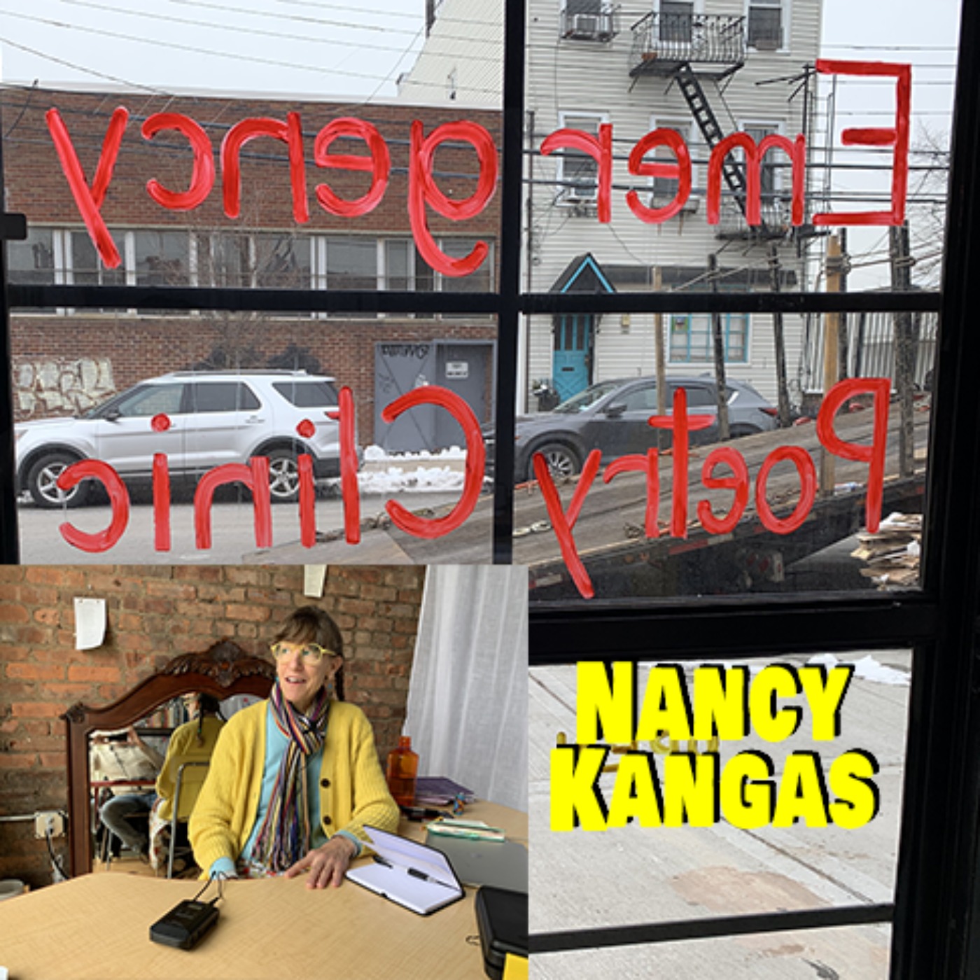 Our producer – Alina Larson – told us about Nancy Kangas’s Emergency Poetry Clinic in Red Hook, Brooklyn. It seemed clear to me that America needs an emergency poetry clinic; I wanted to see what that was about. and so on a recent Tuesday morning I took a subway and a bus and a walk to 166 Van Dyke Street, Brooklyn. Earlier that morning I looked up “Nancy Kangas” and discovered a creative who defies categorization – Nancy K rides the wind of her whims.