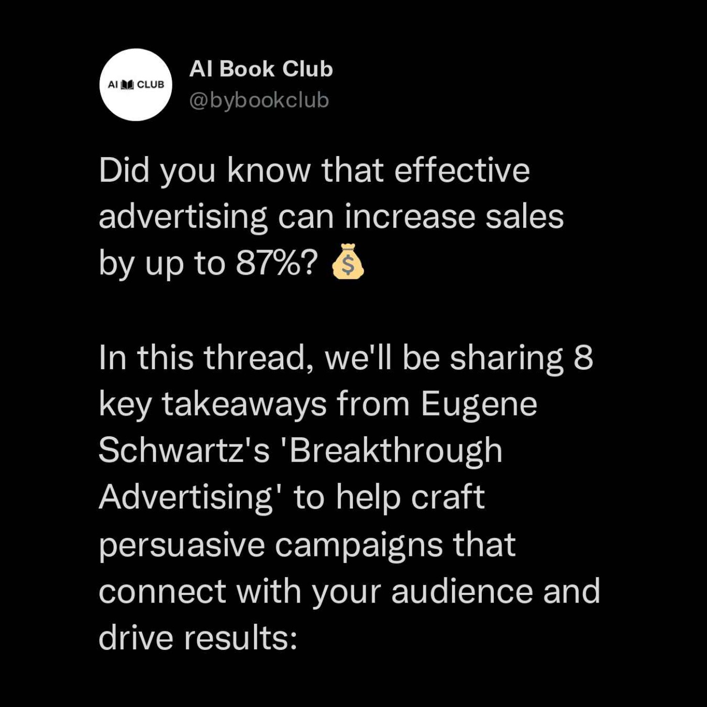 In this episode of AI Book Club, we delve into "Breakthrough Advertising" by Eugene Schwartz. As a legendary copywriter, Schwartz offers invaluable insights on how to craft persuasive and effective advertising campaigns. In this episode, we discuss eight essential takeaways from the book that will help you understand the art of captivating your audience, differentiating your product, and creating compelling messages that drive results. From understanding your audience's desires to the power of storytelling, these takeaways will equip you with the knowledge to transform your advertising efforts. Tune in to learn how to create powerful and effective advertising campaigns that will connect with your audience and drive results.