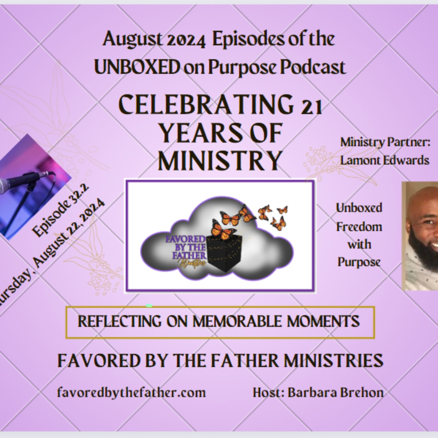 Lamont Purpose Edwards and Barbara A. F. Brehon joyfully celebrate 21 years of Favored by the Father Ministries. He gave several reflections of how the ministry has both nurtured and empowered him.