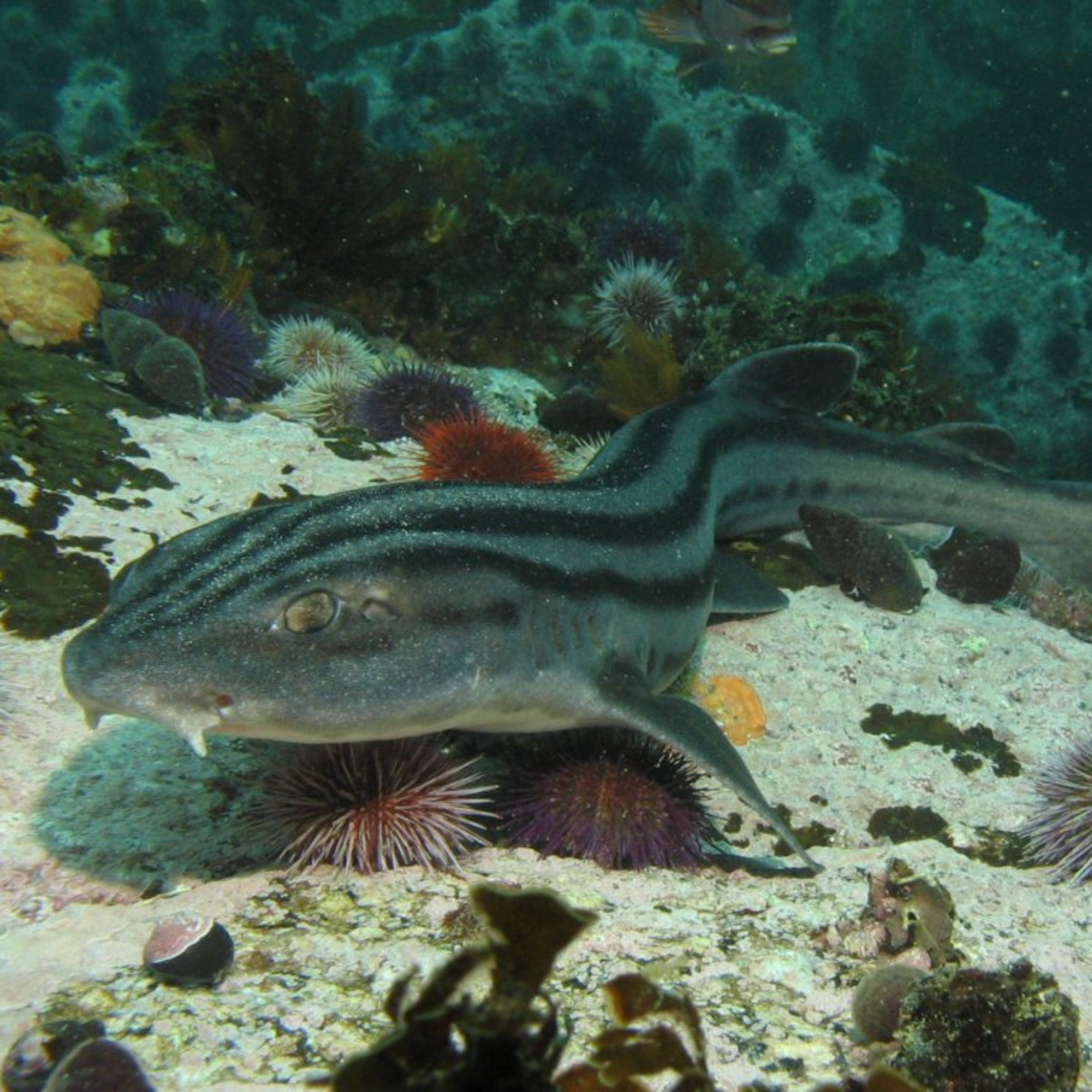 Quick facts about this calm, bottom-dwelling shark! The pyjama shark (Poroderma africanum, striped catshark, pajama shark). Pyjama shark facts!