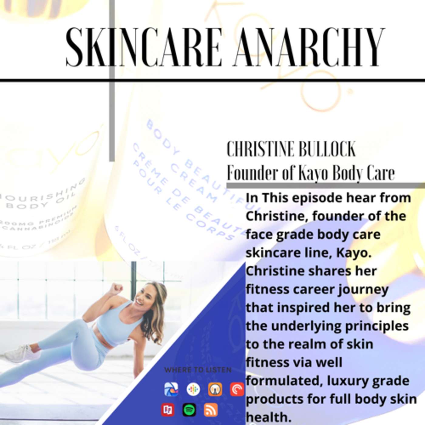 In This episode hear from Christine, founder of the face grade body care skincare line, Kayo. Christine shares her fitness career journey that inspired her to bring the underlying principles to the realm of skin fitness via well formulated, luxury grade products for full body skin health.--- Send in a voice message: https://podcasters.spotify.com/pod/show/skincareanarchy/messageSupport this podcast: