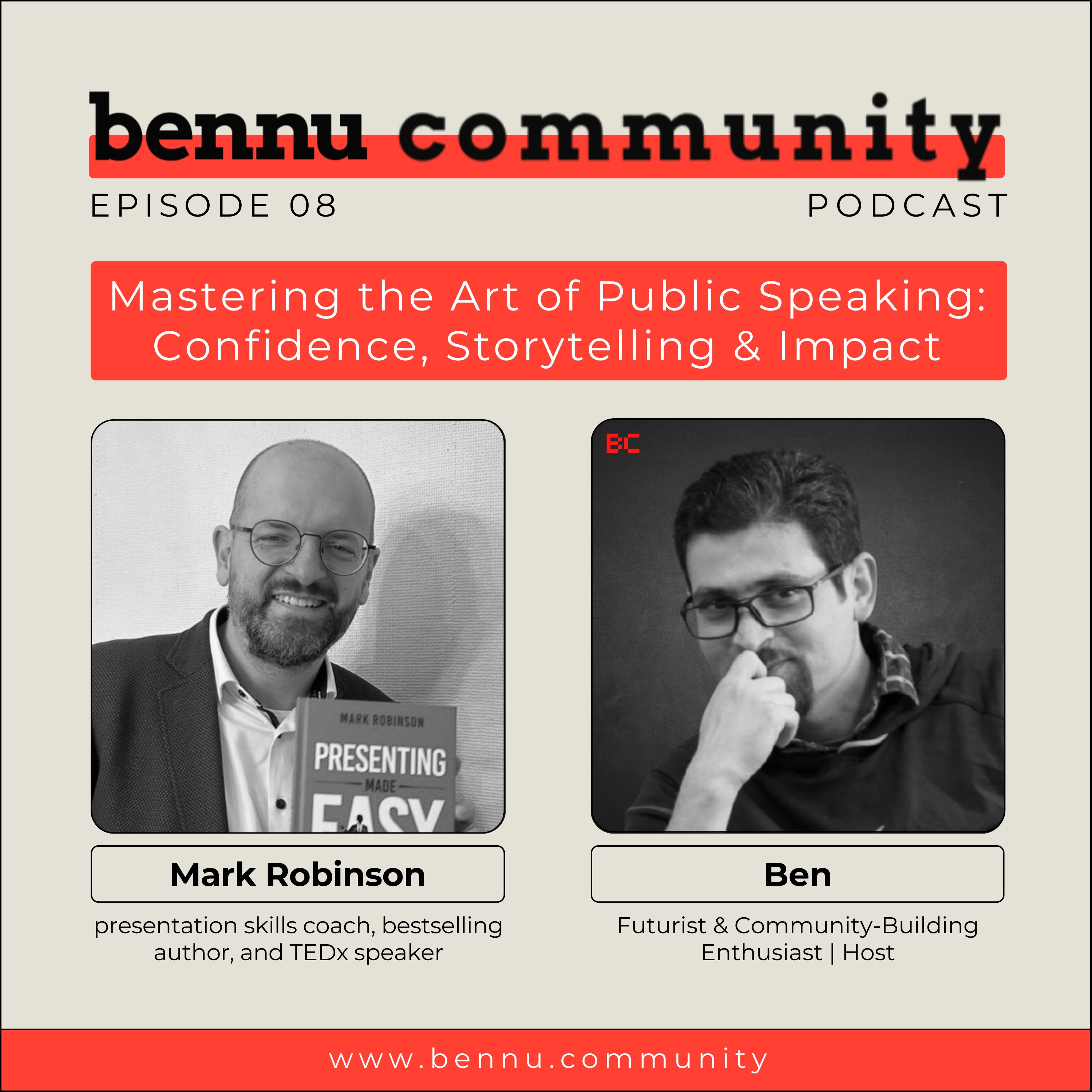 In Episode 8 of the Bennu Community Podcast, we’re joined by Mark Robinson, a presentation skills coach, bestselling author, and TEDx speaker, who has trained thousands of professionals to communicate with confidence and clarity.