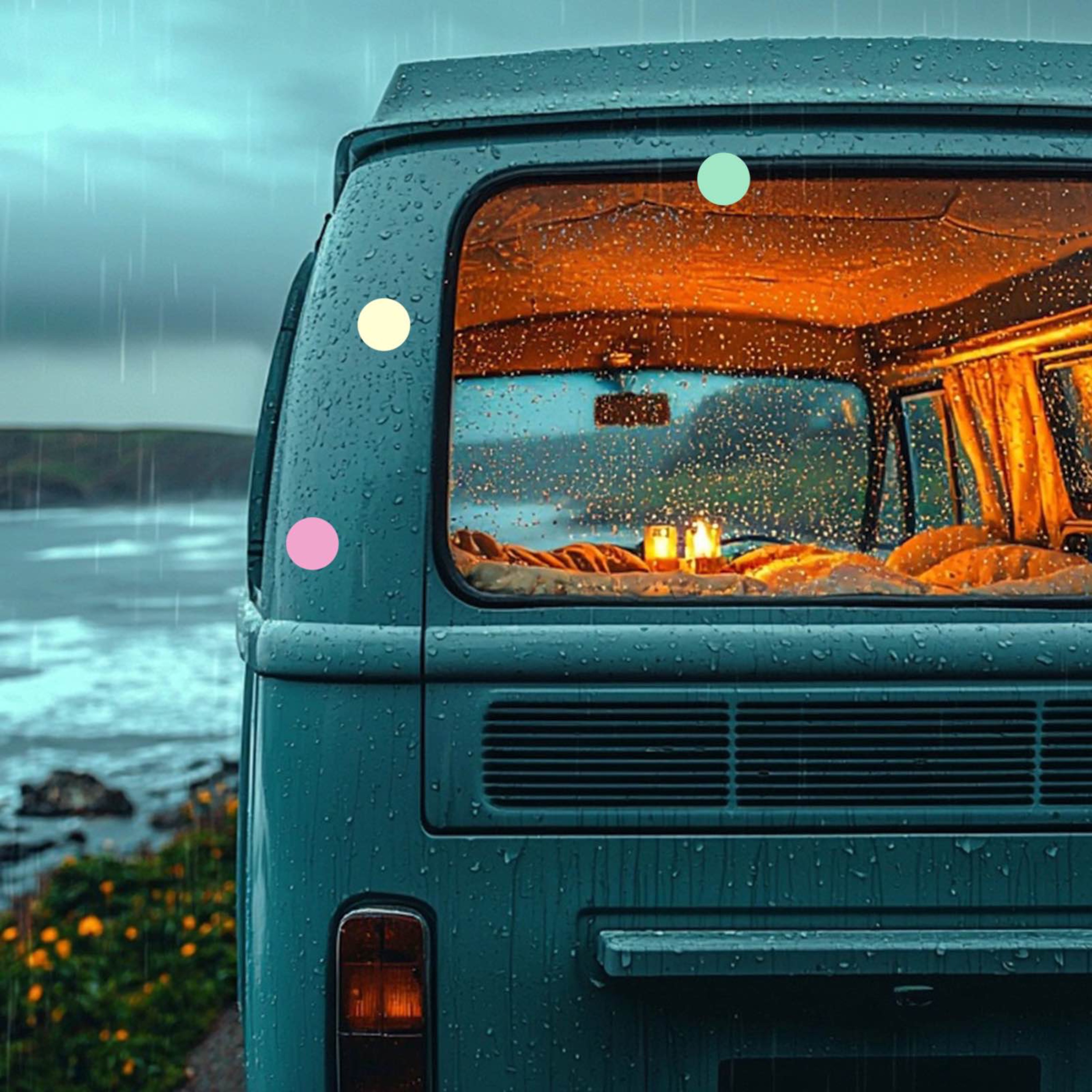 Finden Sie Schutz in einem Vintage-VW, während Regen gegen die Fenster trommelt, die zum Meer hinzeigen. Draußen brechen Wellen unter stürmischen Himmeln, doch drinnen flackert Kerzenlicht sanft am Glas und schafft eine warme Zuflucht. Lassen Sie sich vom Kontrast zwischen dem tobenden Sturm und Ihrem gemütlichen Rückzugsort zu friedlichen Träumen führen. Schlafen Sie sicher und geborgen ein, während die Geräusche der Natur Sie umgeben. Gute Nacht.