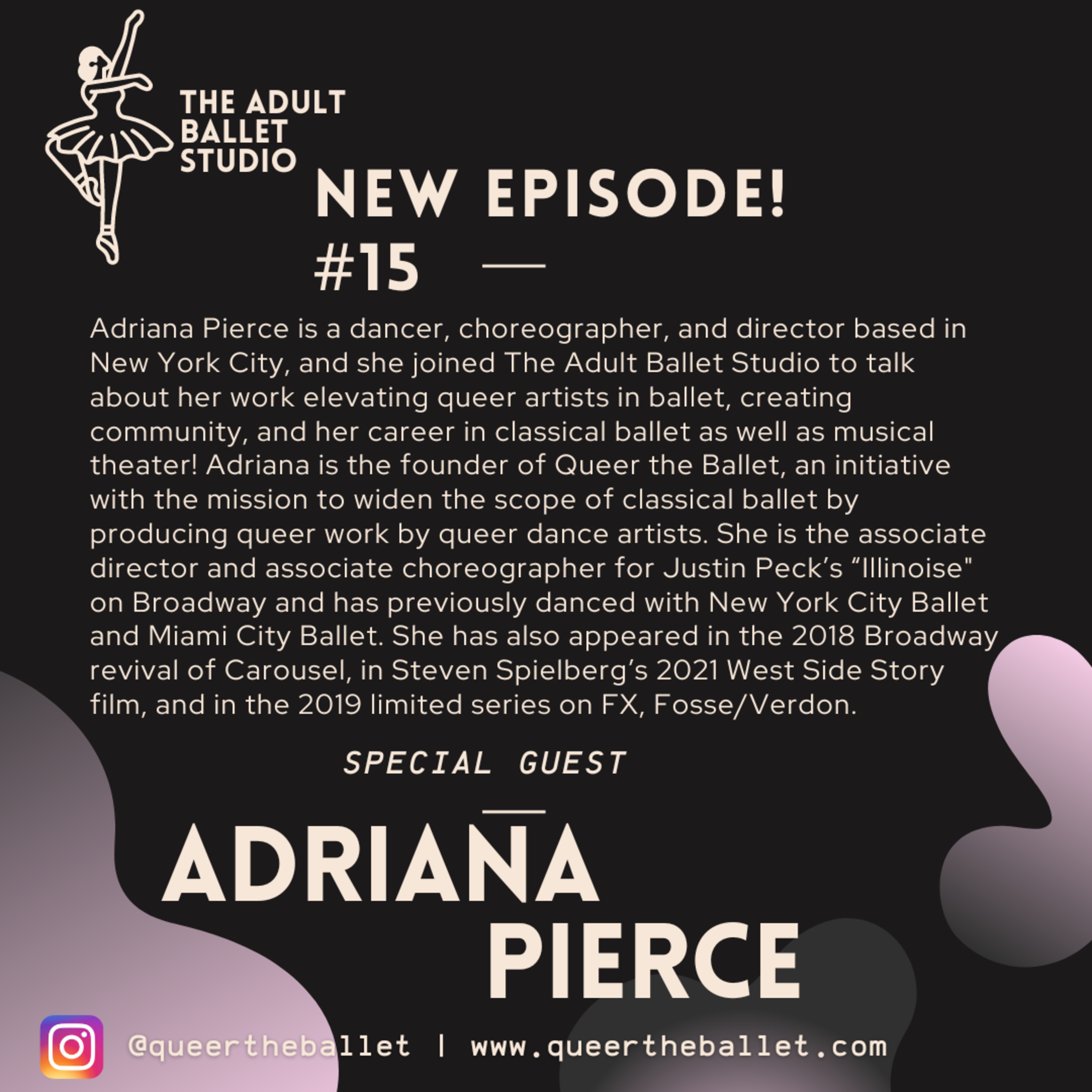 Adriana Pierce is a dancer, choreographer, and director based in New York City, and she joined the studio to talk about her work elevating queer artists in ballet, creating community, and her career in classical ballet as well as musical theater!