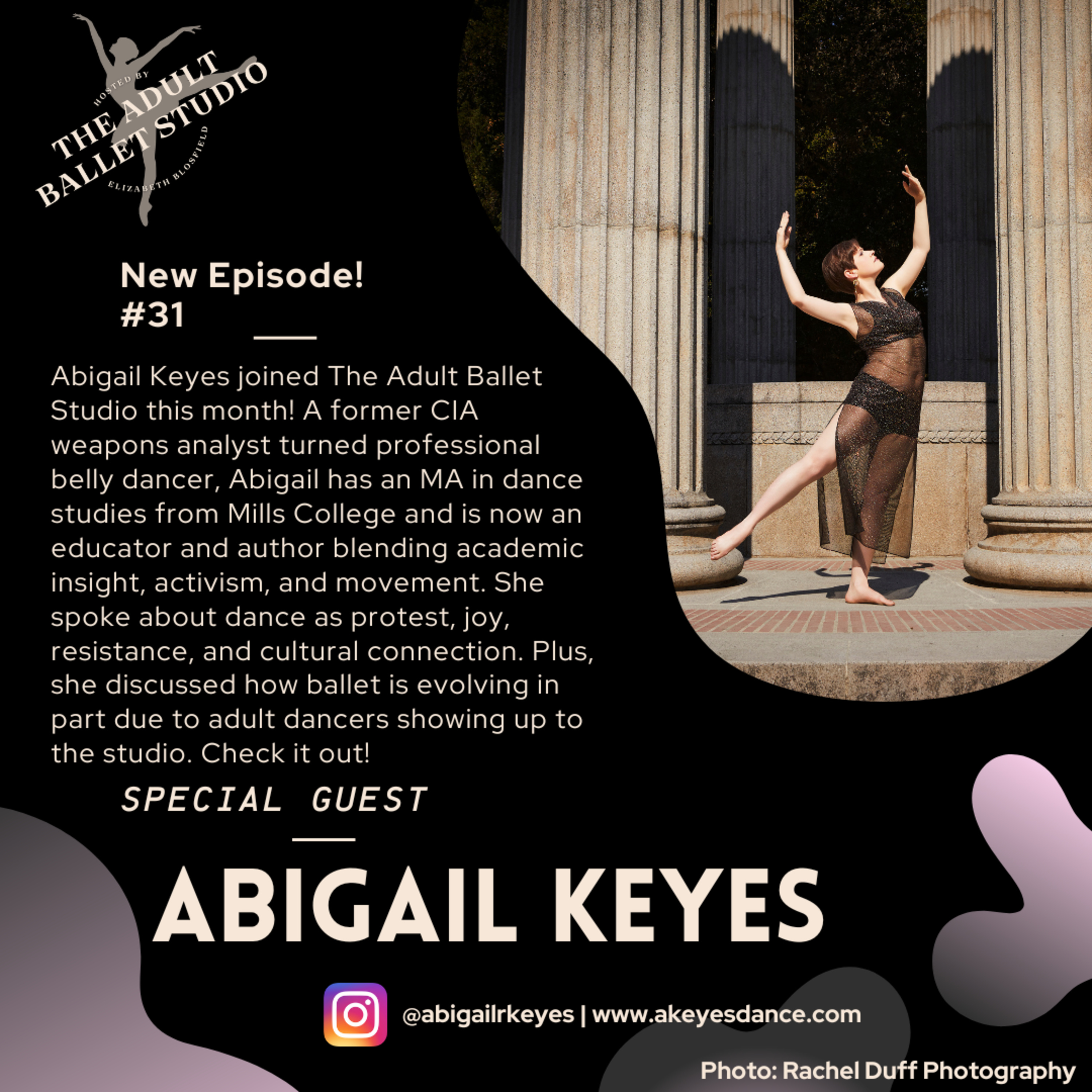 Abigail Keyes is in the studio this month! She is a former CIA political weapons analyst turned professional belly dancer. With a BA in Near Eastern Studies from Princeton and an MA in Dance Studies from Mills College, she blends academic insight with expressive movement and a deep amount of knowledge from her government background. She’s also an educator currently teaching two lecture courses at Skyline College in San Bruno, California.
